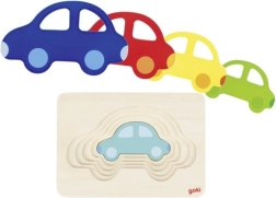 Ši kokybiška medinė dėlionė sudaryta iš kelių skirtingo dydžio automobilių sluoksnių, kuriuos vaikai deda į atitinkamas išpjovas. Kiekvienas automobilis išpjautas iš vieno medžio gabalo, o į konkretaus sluoksnio vietą įsistato tik tinkama detalė – taip vaikai natūraliai lavina erdvinę vaizduotę ir loginį mąstymą.