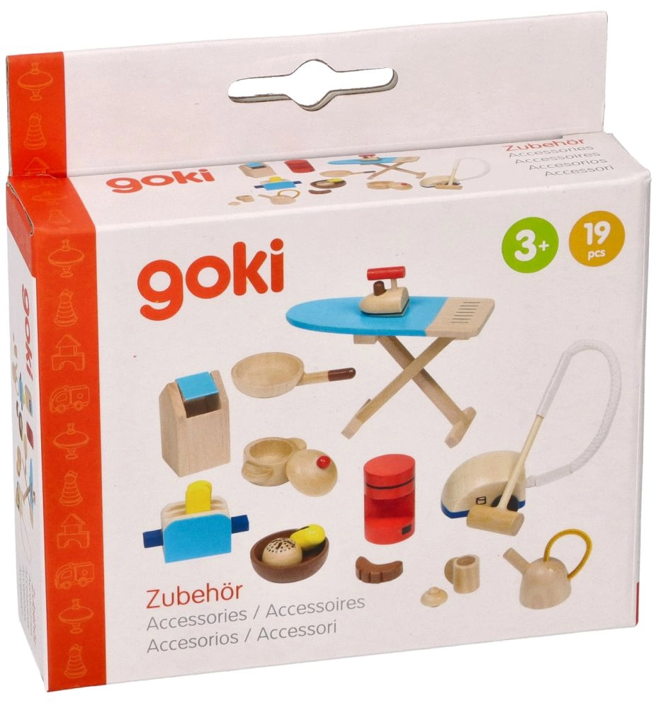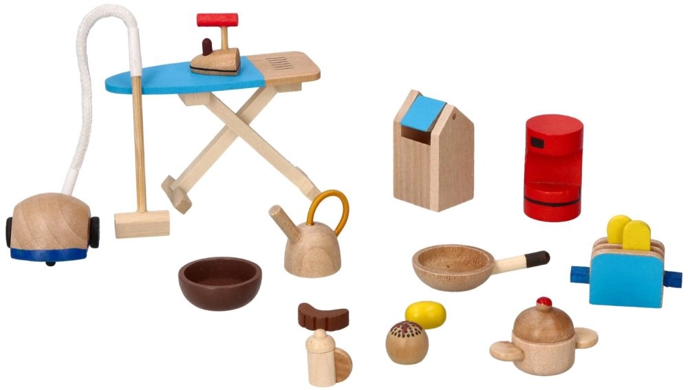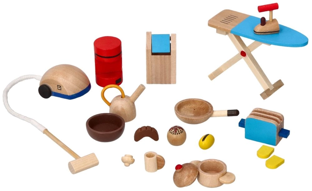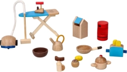 Su šiuo nuostabiu 19 medinių žaislų rinkiniu vaikai mėgausis valandomis pramogų namų aplinkoje. Rinkinį sudaro įvairūs buitiniai prietaisai, kurie padeda vaikų raidai ir supažindina su pasauliu aplink mus. Pakuotėje rasite tokius žaislus kaip kavos aparatas, arbatinukas, siurblys, lyginimo lenta ir daug daugiau. Kiekviena detalė kruopščiai pagaminta atsižvelgiant į saugumą ir estetiką.