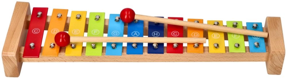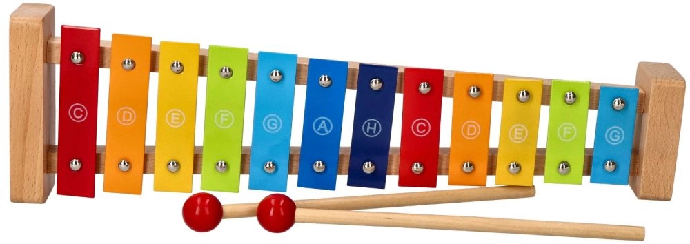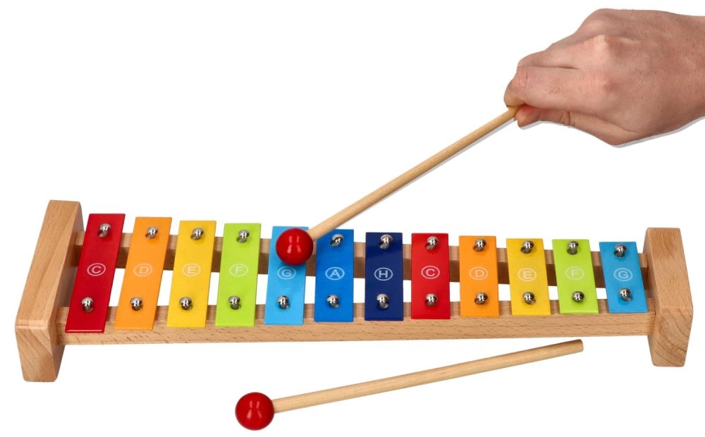 Patvarus medinis rėmas ir 12 metalinių klavišų suteikia malonų skambesį ir ilgą žaislo tarnavimo laiką.