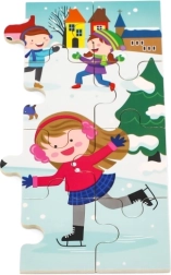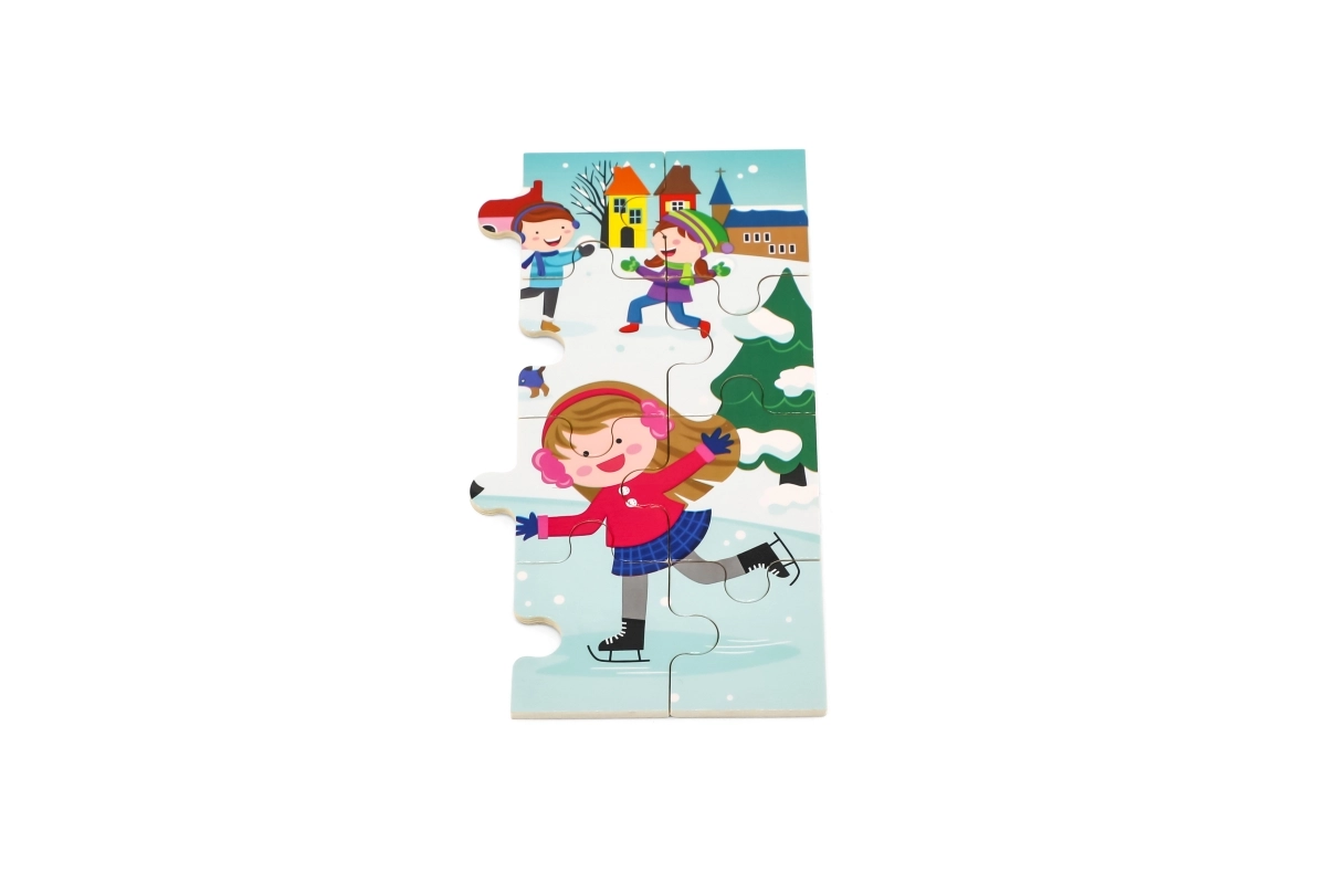 Spalvinga žiemos scena su vaikais sniege skatina dėlioti ir lavina spalvų, detalių bei situacijų suvokimą.