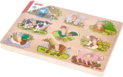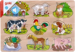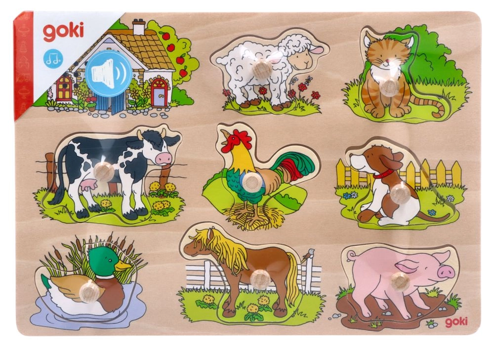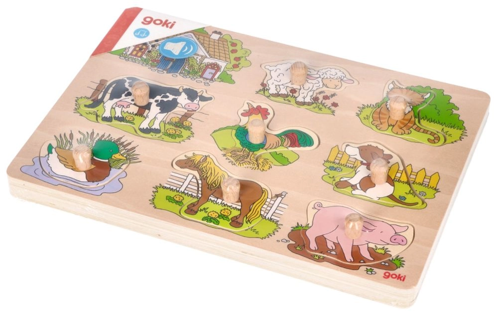 Ši medinė dėlionė turi aštuonias detales su naminių gyvūnų paveikslėliais, kurios, įdėjus į tinkamą angą, leidžia būdingus garsus. Kiekviena detalė turi medinį laikiklį, todėl ją lengviau suimti ir saugiai įstatyti į pagrindą. Medinis pagrindas su tiksliomis išpjovomis padeda vaikams padėti detales į reikiamas vietas.