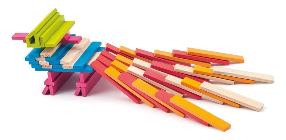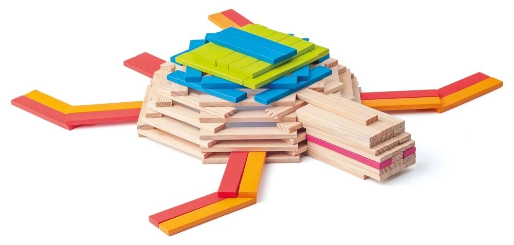 Vienodos kaladėlės lengvai dėliojamos į bokštus, tiltus, gyvūnus ir transporto priemones. Vaikai lavina fantaziją ir planavimą, o statiniai išlieka stabilūs.