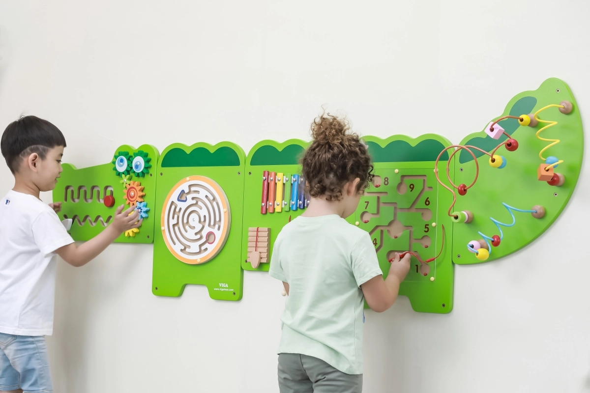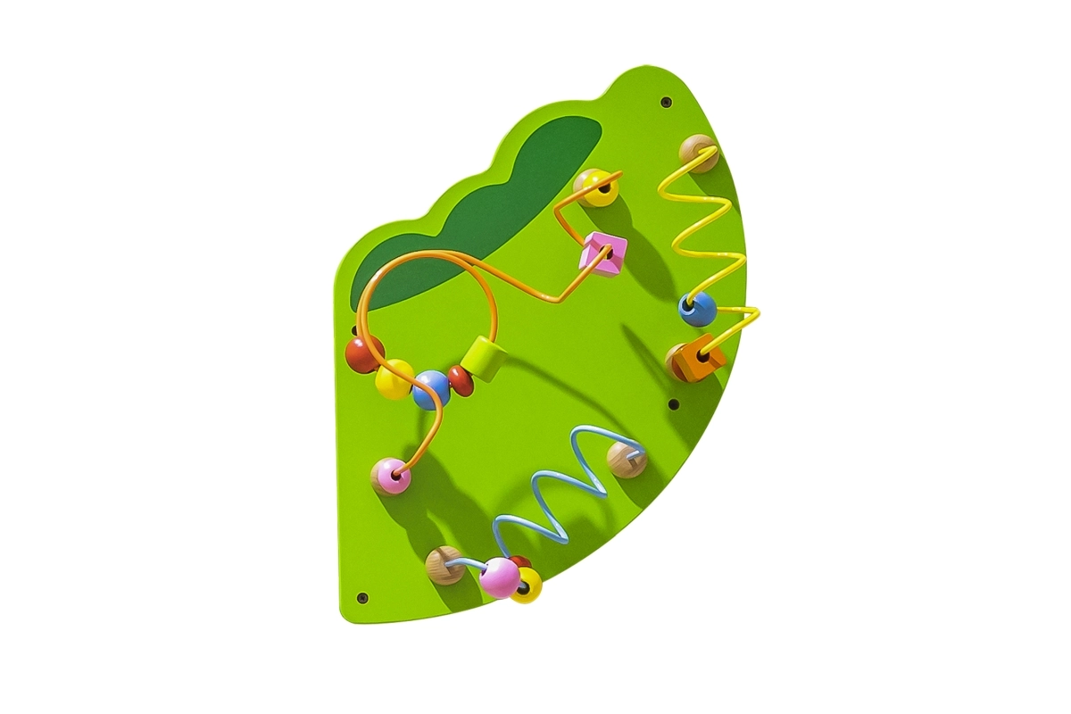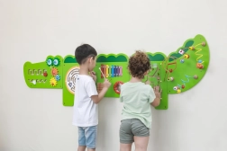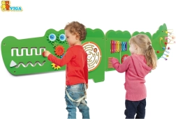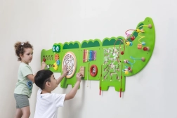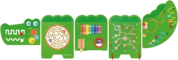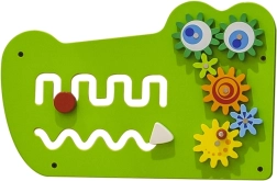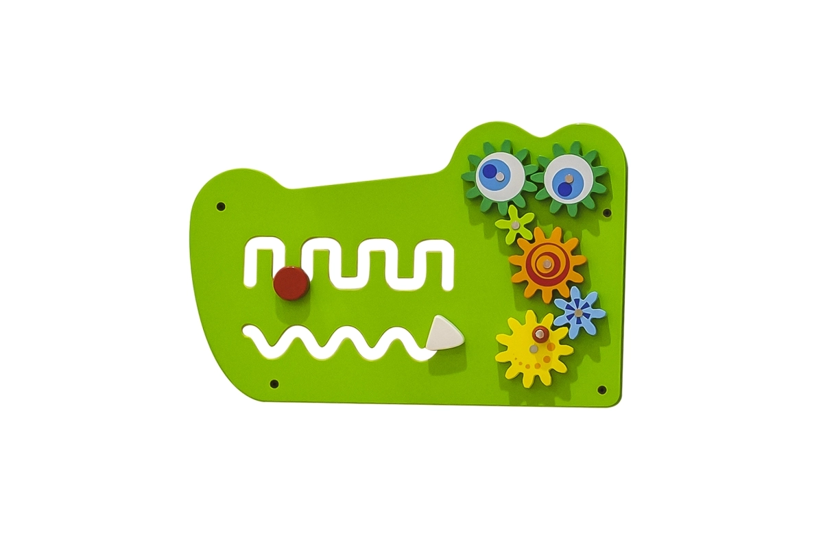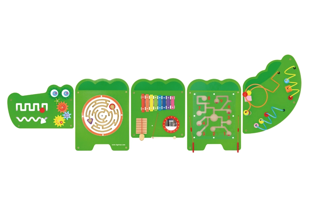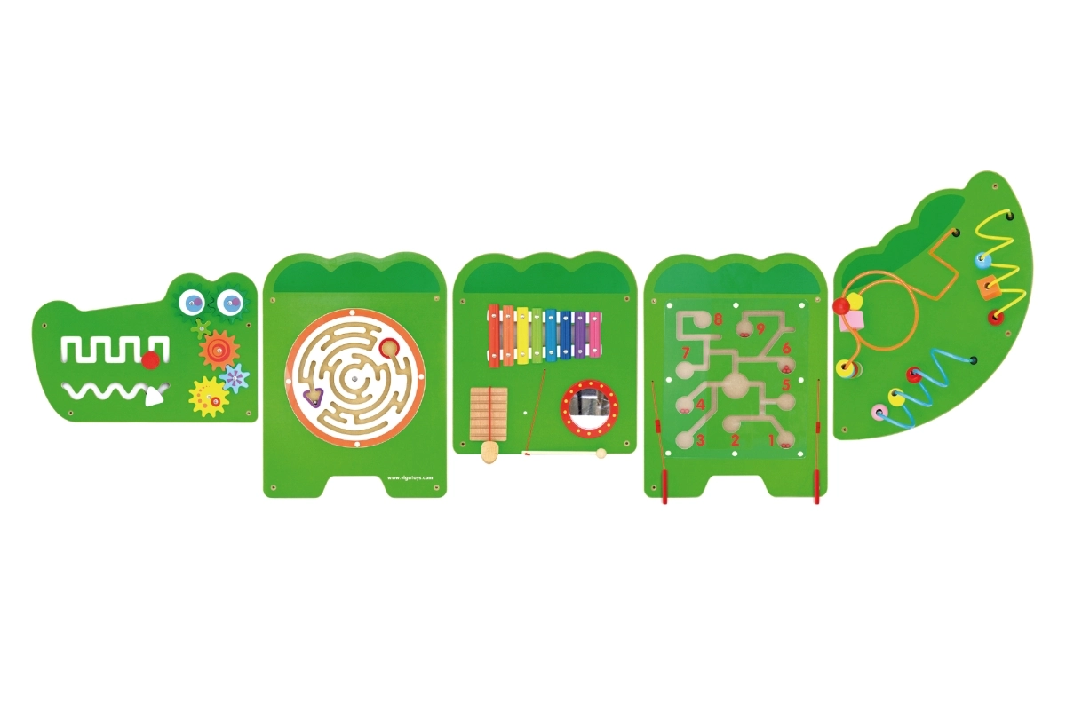 Sieninė lenta „Krokodilas“, padalinta į penkias dalis, siūlo vaikams įvairias veiklas: galvos dalis su labirintais ir dantytųjų ratų pavaromis, apvalus kamuoliuko labirintas, muzikinis skydelis su spalvotu ksilofonu ir barškančia, rumbuota plokštuma, magnetinis labirintas su dviem magnetinėmis lazdelėmis ir uodega su trimis 3D karoliukų trasomis. Kiekviena sekcija lavina skirtingus įgūdžius ir skatina vaikus tyrinėti.