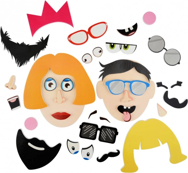 - 35 detalės – akys, nosys, burnos, plaukai, akiniai, karūna ir kiti aksesuarai