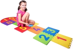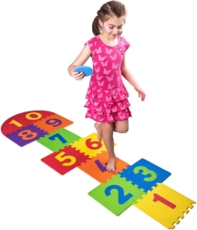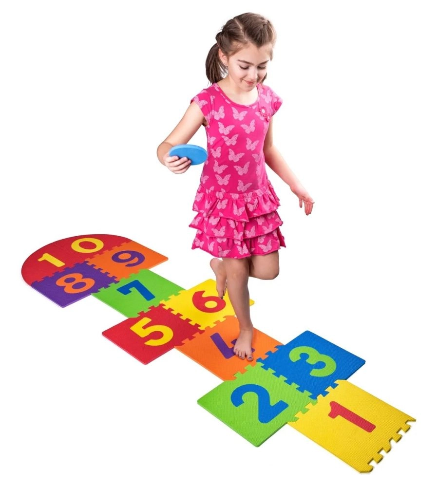 Šokinėjimas per sunumeruotas dalis ir žiedų mėtymas lavina pusiausvyrą, koordinaciją, vikrumą ir skaitmeninį suvokimą.