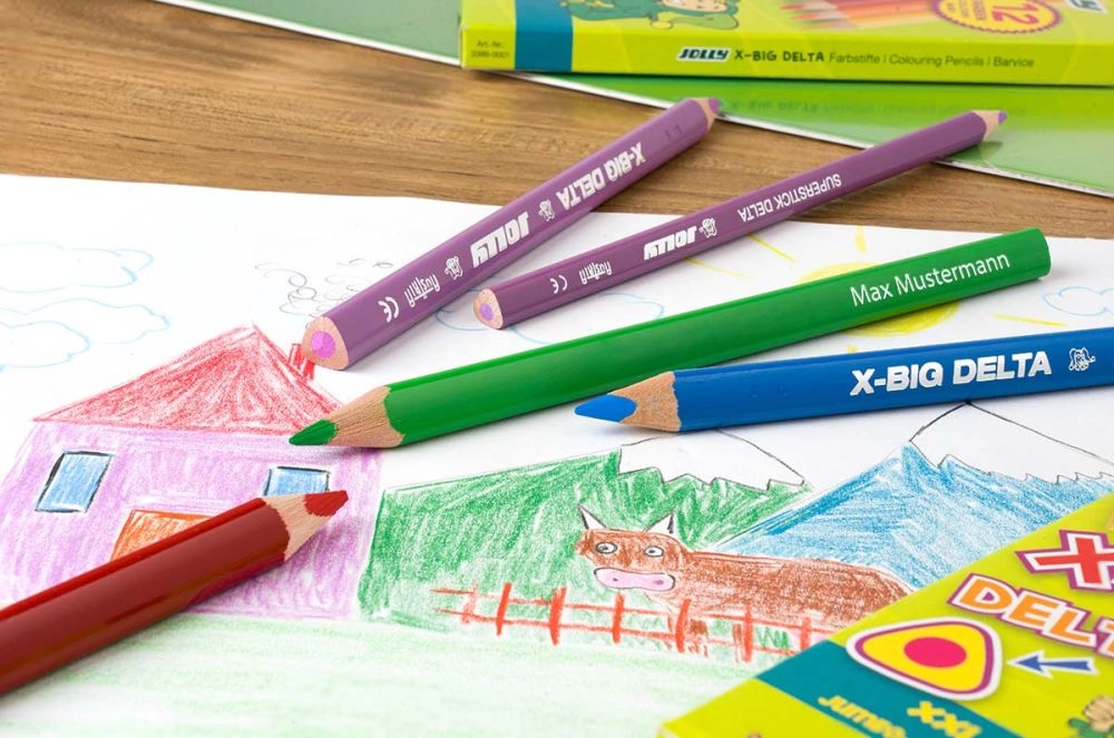 Rinkinys didelių trikampių pieštukų X-Big Delta siūlo 12 ryškių spalvų, kurios idealiai tinka vaikų kūrybai. Dėl ergonomiškos formos pieštukus patogu laikyti vaikams nuo 3 metų.