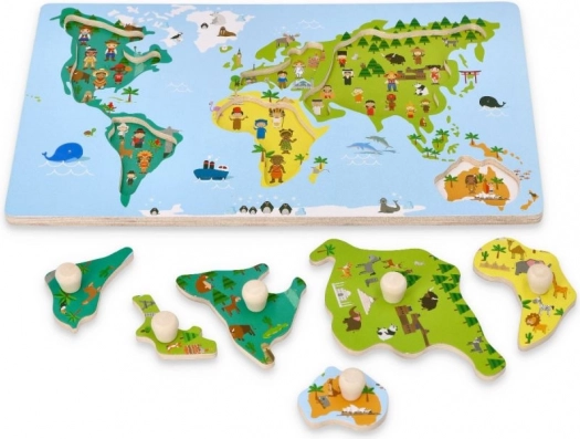 Dėlionė vaizduoja žemynus ryškiomis spalvomis su pieštiniais gyvūnais ir lankytinomis vietomis, todėl vaikams lengviau mokytis ir geografija tampa įdomi.