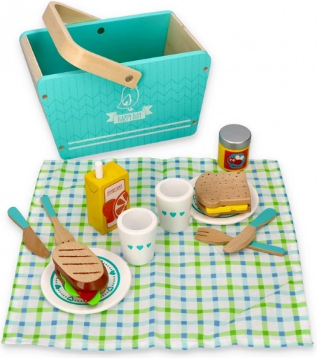 Šis mėtų spalvos pikniko rinkinys pradžiugins kiekvieną mažą šeimininką. Tvirtame mediniame krepšelyje rasite lėkštutes, stalo įrankius ir įvairų medinių maisto produktų pasirinkimą – kepinius, sūrį, vaisius ir gėrimus – kartu su languota servetėle stilingam serviravimui. Rinkinys puikiai tinka vaidmenų žaidimams ir mokymuisi per žaidimą.