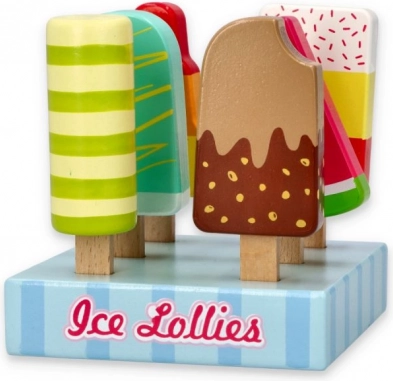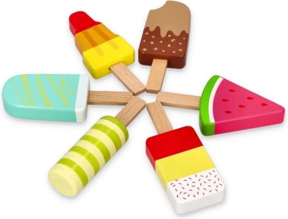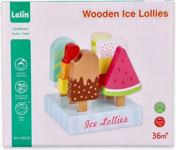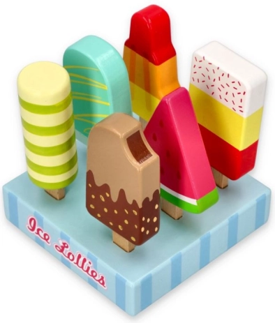 Spalvingas medinių ledinukų rinkinys ant patogaus stovo suteiks 3+ metų vaikams valandų kūrybiško žaidimo. Skatina vaizduotę, parduotuvės ir ledainės vaidmenų žaidimą, lavina smulkiąją motoriką ir akių–rankų koordinaciją. Patvari medinė konstrukcija, saugios dažų medžiagos ir žavūs dizainai užtikrina, kad ledinukai taps mėgstamu žaislu kiekviename vaikų kambaryje.