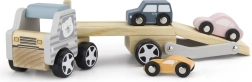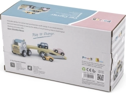 Dviejų lygių priekaba su nuleidžiama rampa skatina realistišką žaidimą ir sekų mokymąsi – vaikai patys krauna ir iškrauna mašinėles.