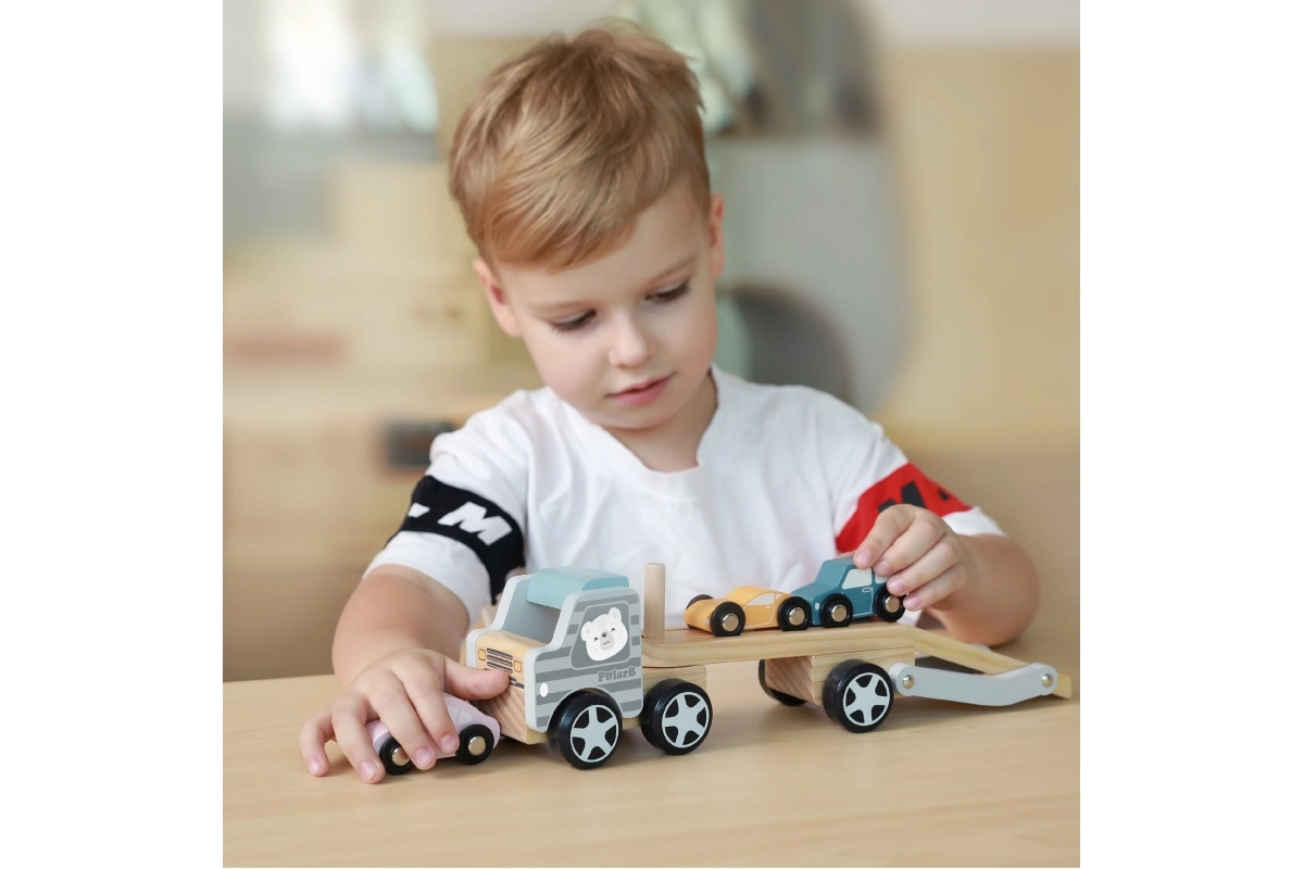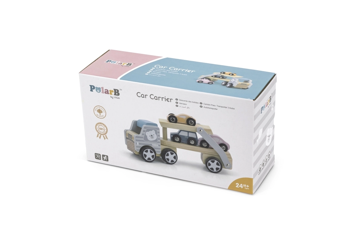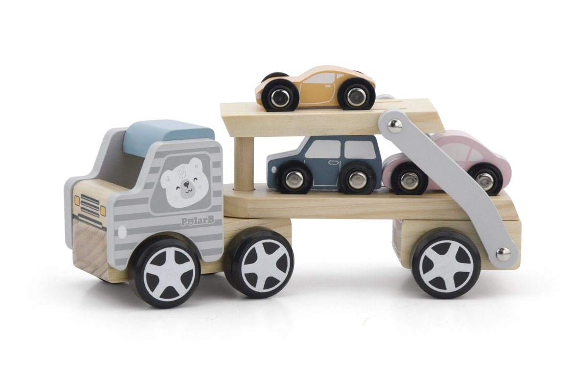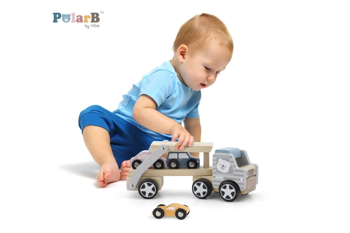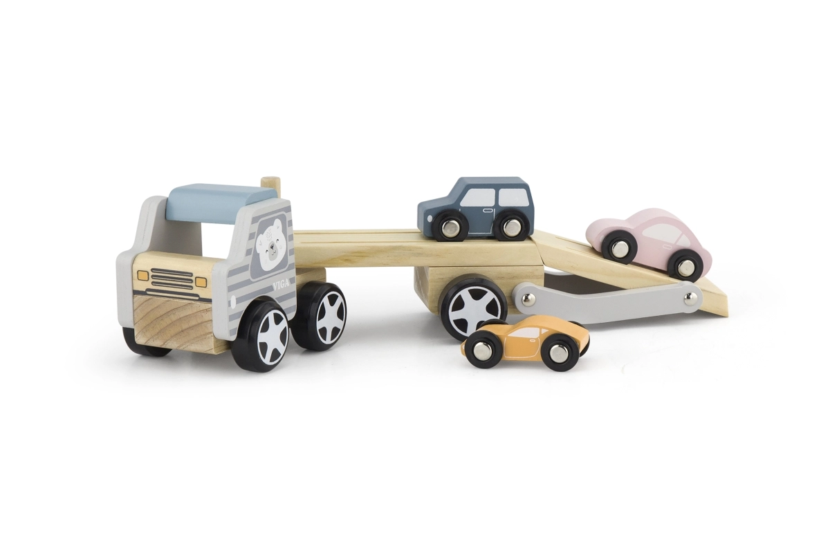 Medinis tralas VIGA PolarB vaikams suteikia ir pramogą, ir mokymąsi viename. Rinkinyje – sunkvežimis su priekaba ir trys spalvingos mašinėlės, kurias patogu pakrauti naudojant nuleidžiamą rampą. Patvari mediena ir kruopštus apdirbimas užtikrina ilgaamžiškumą, o netoksiški dažai, atitinkantys EN71 ir ASTM standartus, garantuoja saugumą kasdien žaidžiant.