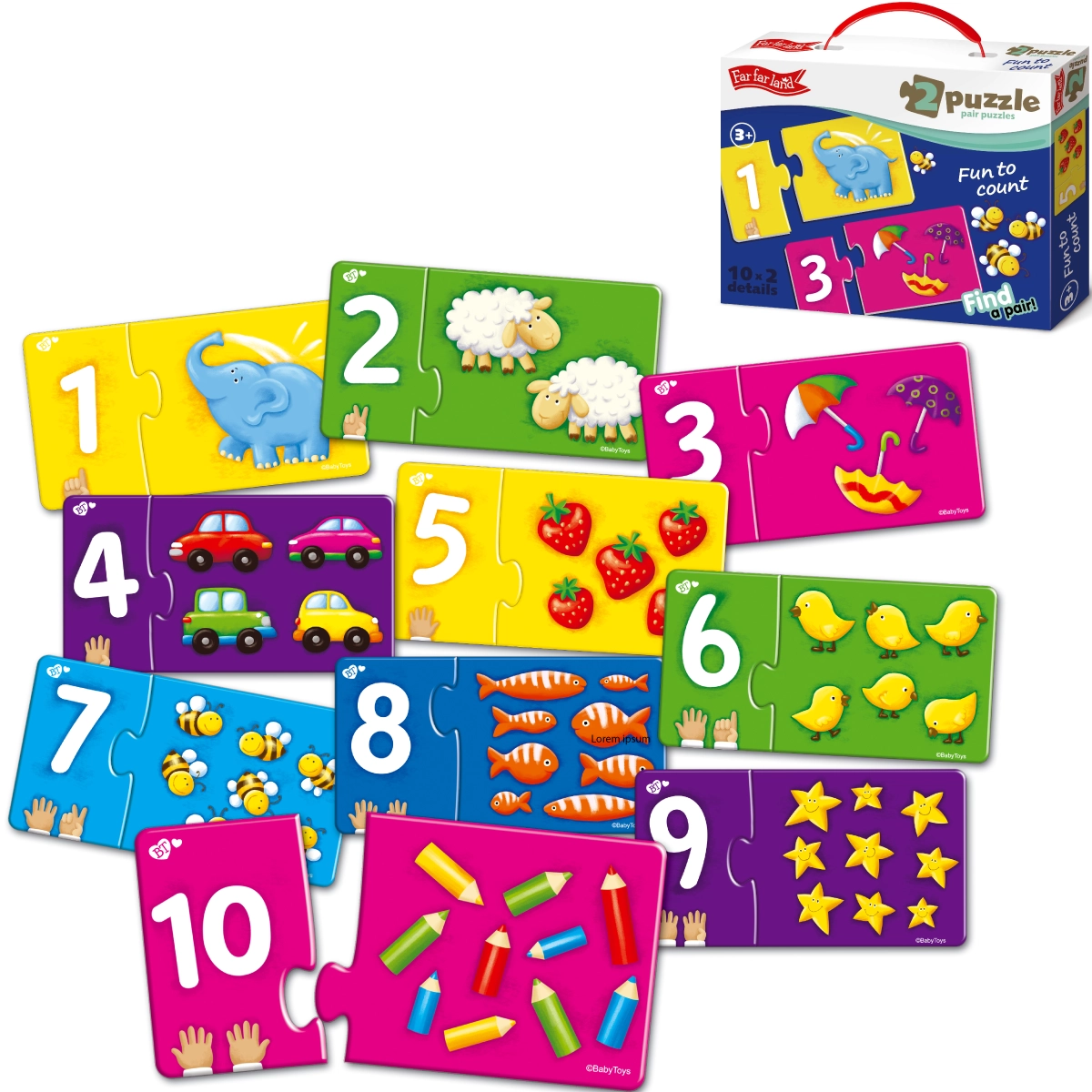 Lavinkite savo poravimo įgūdžius su šiuo Far Far Land Puzzle rinkiniu, kuriame yra 10 unikalių paveikslėlių. Kiekvienas paveikslėlis sudarytas iš dviejų dalių, kad būtų lengva skaičiuoti iki dešimties.