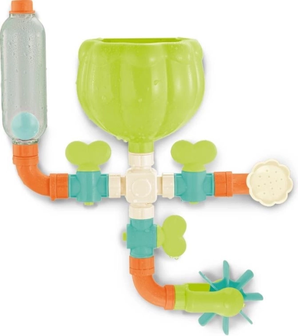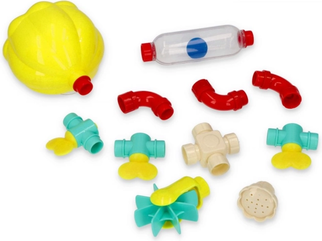 Linksmą vandens sistemą su piltuvėliu, vamzdeliais ir vandens rateliu pamėgs kiekvienas – ji pagyvins kiekvienas maudynes. Vaikas pila vandenį į piltuvėlį ir stebi, kaip vanduo teka skirtingais keliais. Šis interaktyvus žaislas lavina rankos–akies koordinaciją ir skatina natūralų fizikos reiškinių pažinimą.
