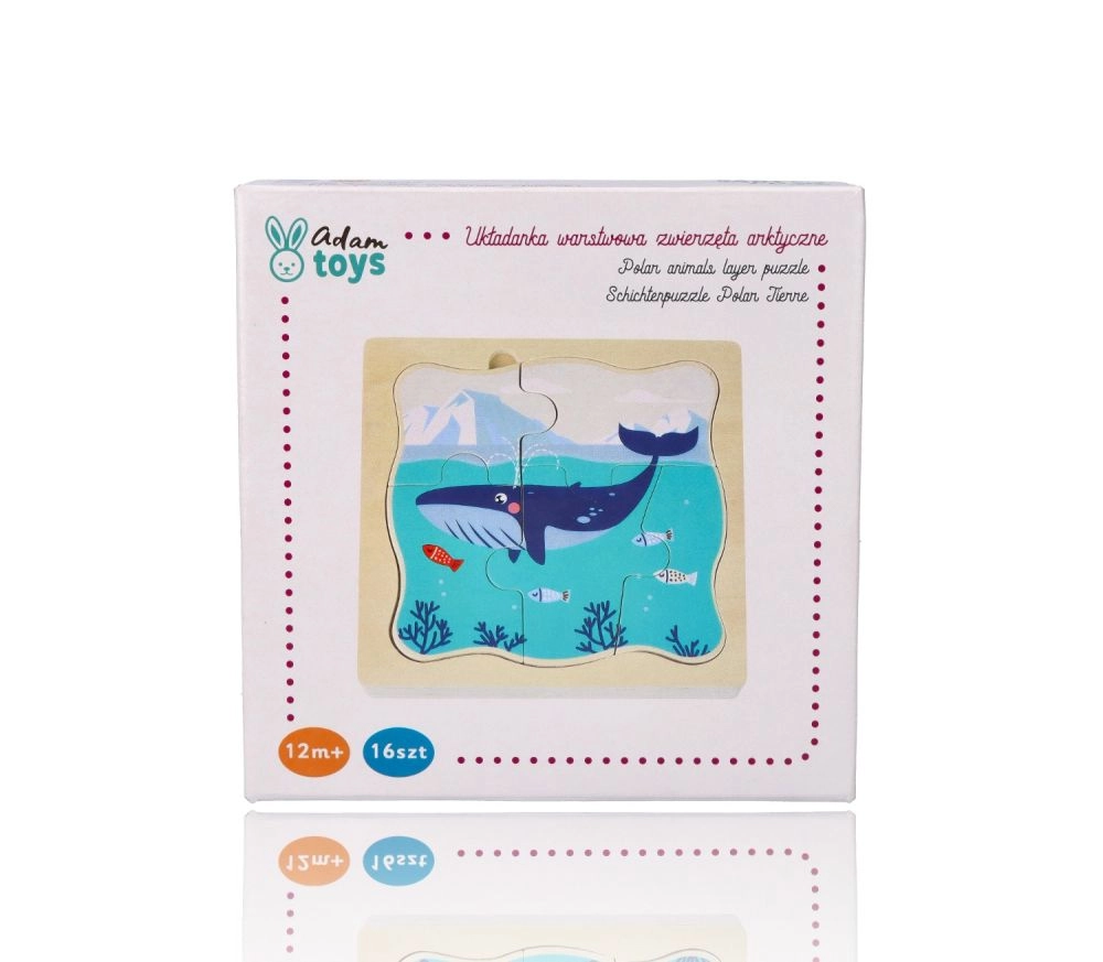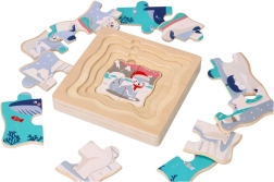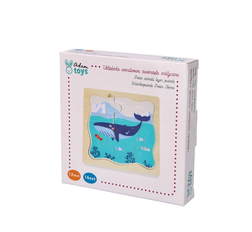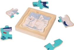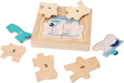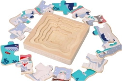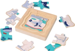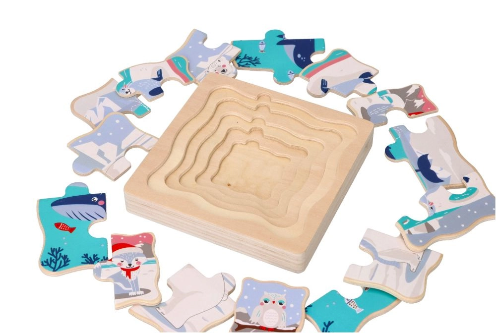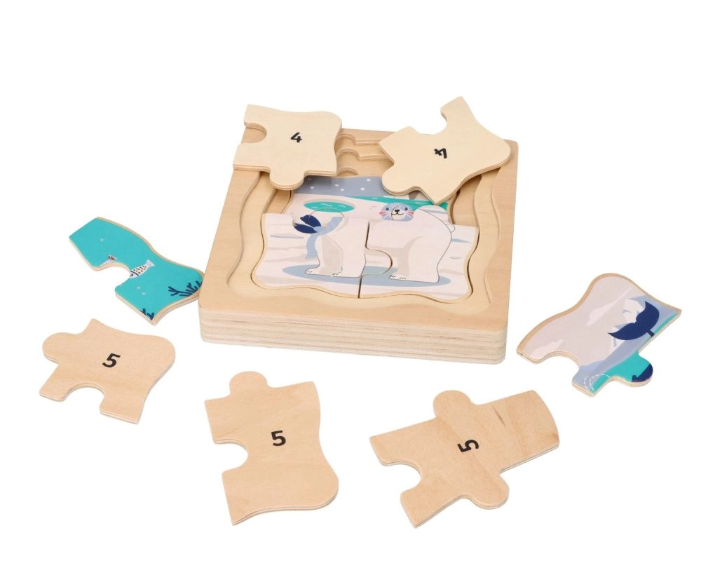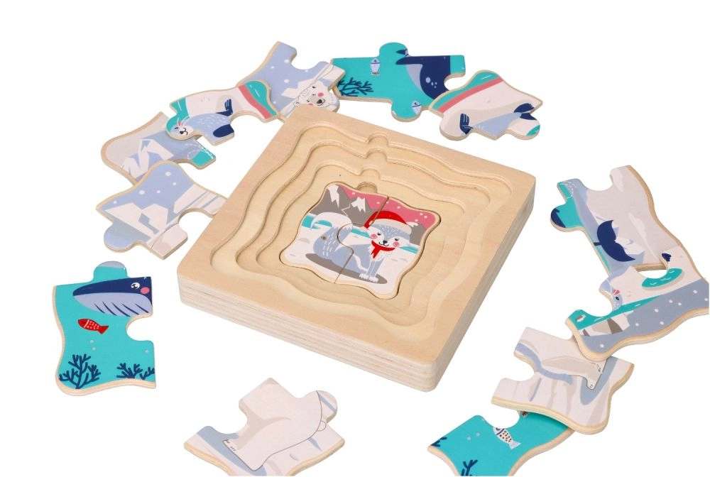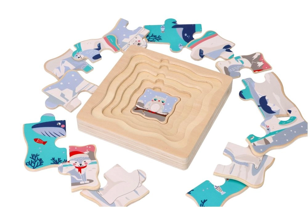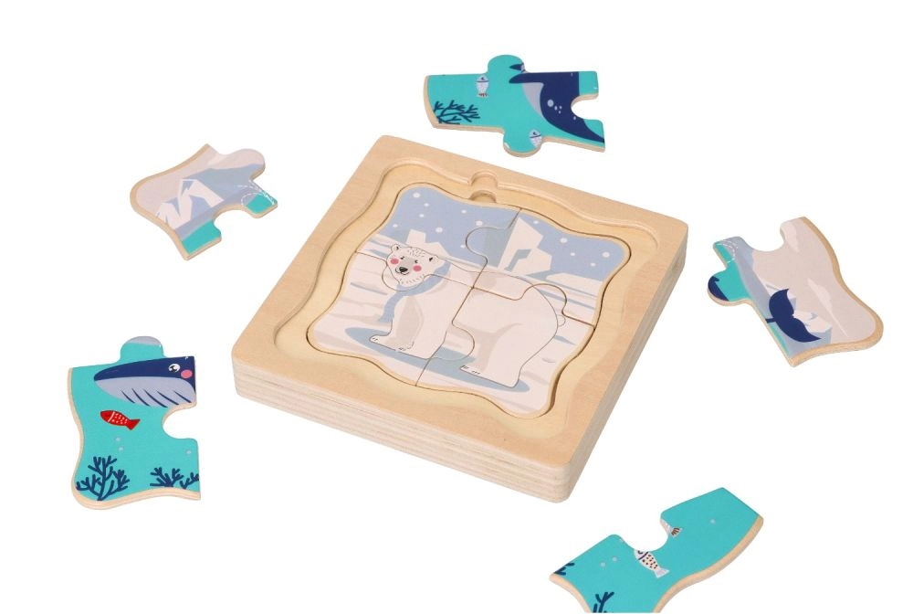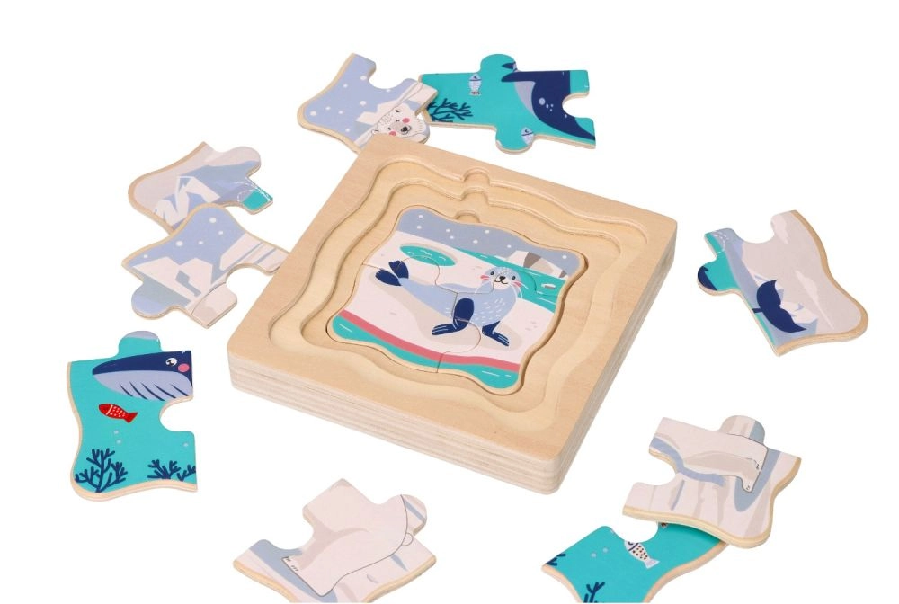 Ši medinė sluoksniuota dėlionė su Arkties dvelksmu pateikiama su 15 ryškiaspalvių dėlionės detalių ir kokybiška medine baze. Ji sukurta tam, kad pagerintų vaikų kognityvinę raidą ir koordincijos įgūdžius.