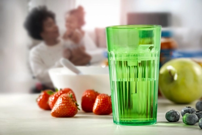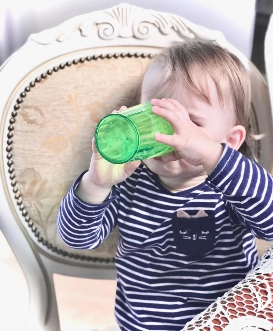 Specialus įdėklas puodelio viduje sulėtina skysčio tekėjimą, todėl vaikas saugiai įpranta gerti iš atviro puodelio be snapelių ir šiaudelių.