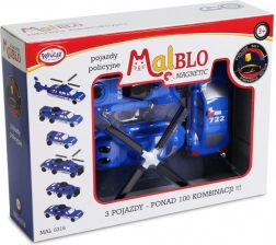 Atraskite veiksmo pasaulį su MalBlo MAGNETIC policijos serija. Dėka sumanios magnetinės ir spragtelėjimu tvirtinamos jungties vaikai lengvai sujungia modulius ir akimirksniu sukuria sraigtasparnį, automobilį ar specialiosios paskirties transportą. Rinkinyje yra 9 dalys (3 paruoštos transporto priemonės), kurias galima laisvai derinti į dešimtis unikalių variantų.