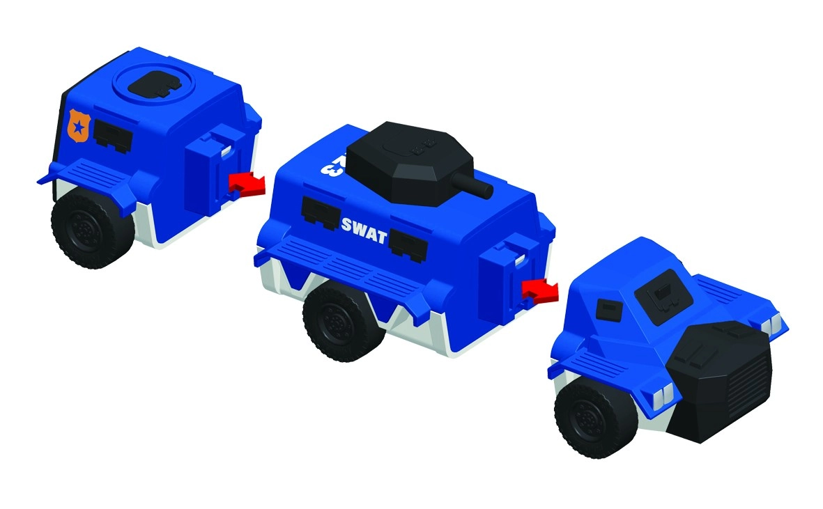 Tvirtas, bet saugus sujungimas leidžia vaikams greitai keisti dalis ir be pastangų kurti naujas policijos mašinas.