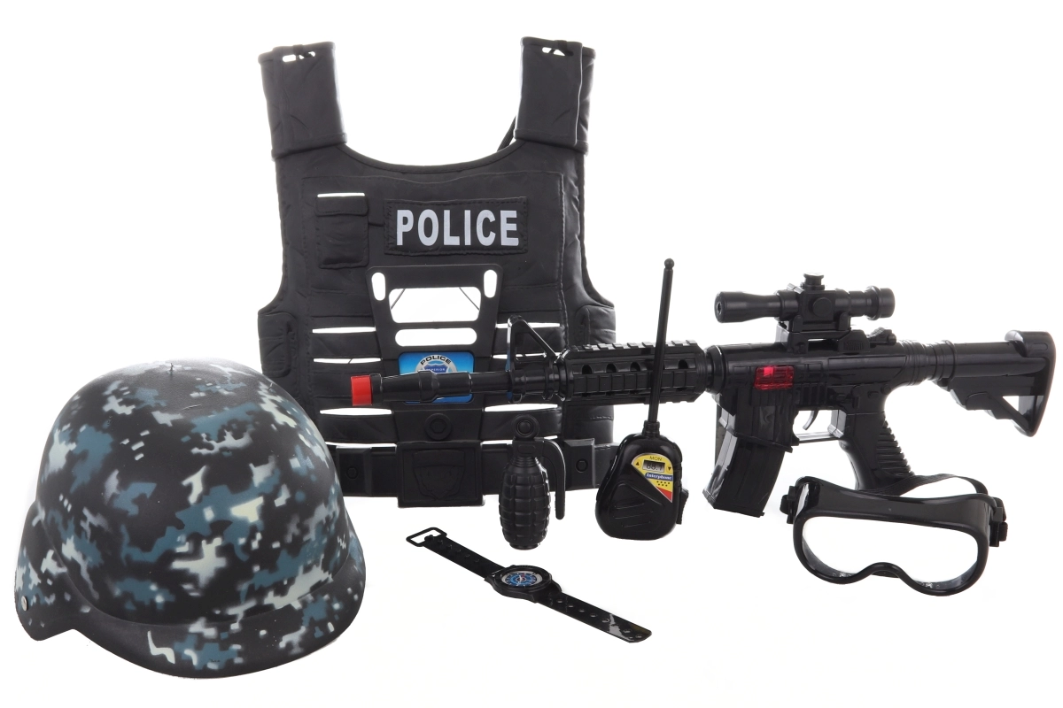 Šalmas, akiniai, racija, granata ir laikrodis sudaro visavertį policijos rinkinį. Dėl tinklinės pakuotės viskas išlieka tvarkingai vienoje vietoje.