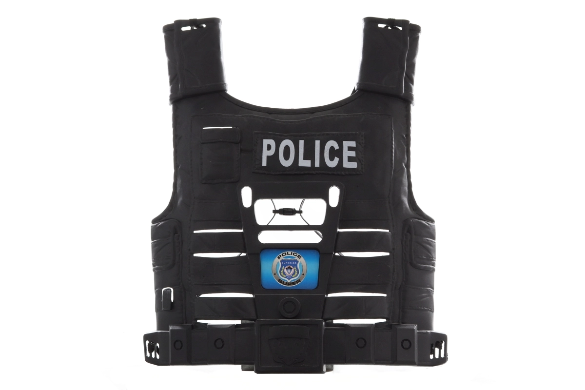 Realistiška policijos įranga vaikų persirengimui ir kasdieniams nuotykiams. Juoda liemenė su užrašu POLICE siūlo autentišką išvaizdą ir praktiškas kišenes, automatas su barškančiu efektu sustiprina veiksmo įspūdį, o šalmas su kamufliažiniu motyvu užbaigia visą aprangą.