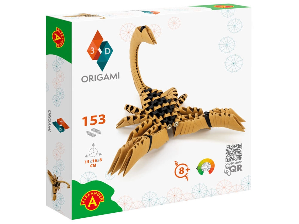 3D origami Skorpionas iš Alexander – smagi ir raminanti kūrybinė veikla vaikams ir suaugusiesiems. Detalės turi patentuotą formą su įspausta lenkimo linija, todėl pagrindinį modulį sulankstysite trimis paprastais judesiais, o vėliau jas suspausite tarpusavyje be klijų. Baigtas modelis atrodo dekoratyviai ir taps originalia kambario puošmena.