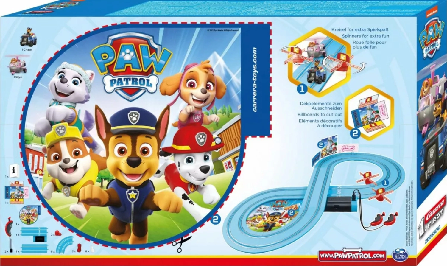Linksma mažiausiems skirta lenktynių trasa su serialo PAW PATROL herojais siūlo 2,4 m ilgio trasą, du automobilius – Chase ir Skye, paprastus baterijomis maitinamus valdiklius ir žaismingus elementus, įskaitant besisukančius sraigtus. Idealiai tinka kaip pirmasis lenktynių rinkinys vaikams nuo 3 metų – kokybiškas CARRERA gaminys.
