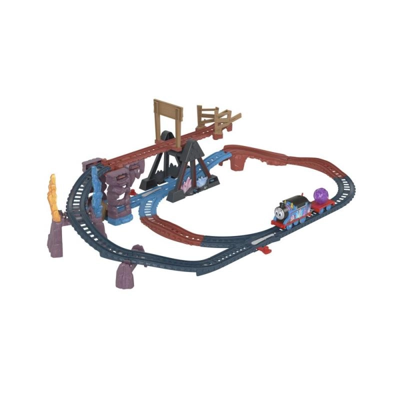 Leiskitės su Tomu į kristalų nuotykį! Šis veiksmo traukinių trasos rinkinys siūlo daugiaaukštę trasą su krintančiu tiltu, sankryža ir teminiais „kristalų“ elementais. Vienu jungikliu ant Tomo mašinėlės stogo jis pajuda bėgiais ir pristato krovinį į olą.