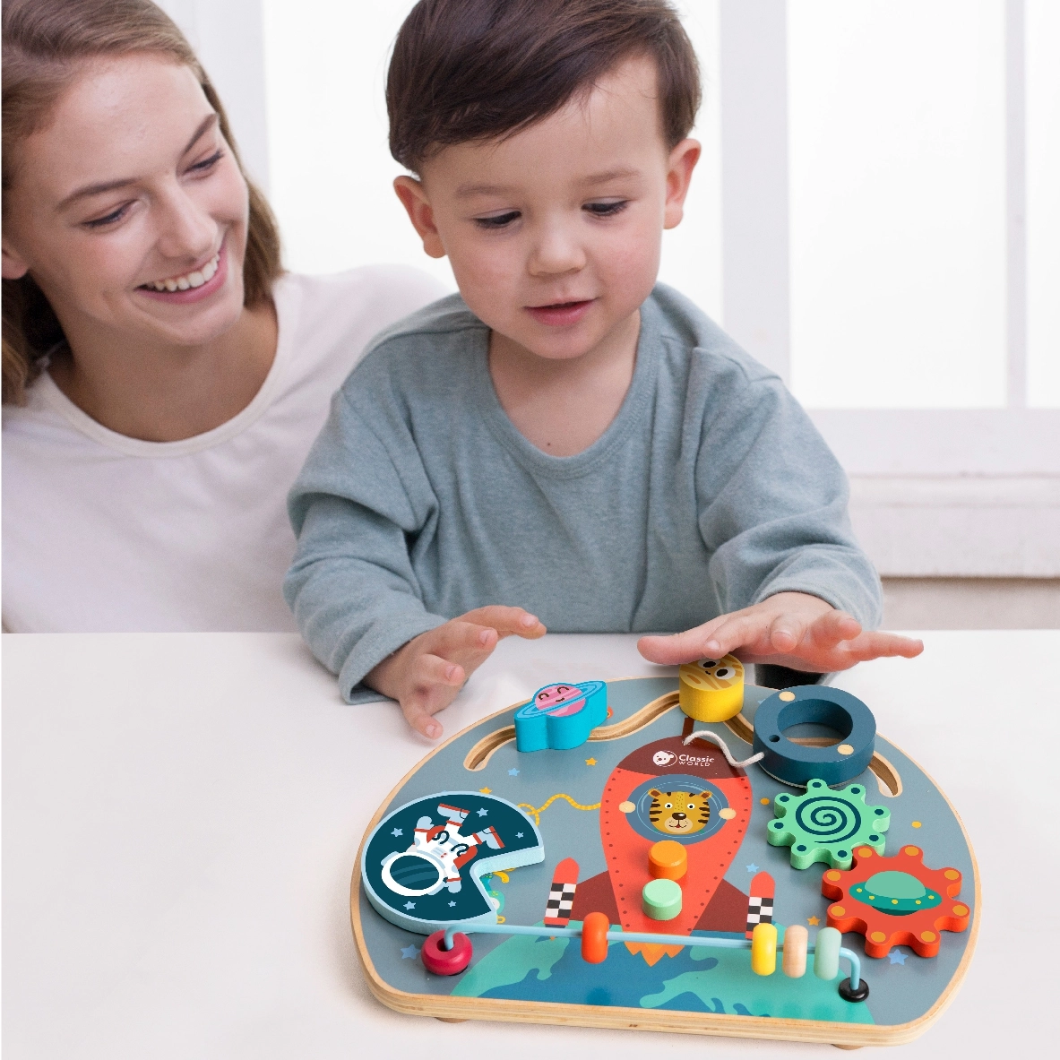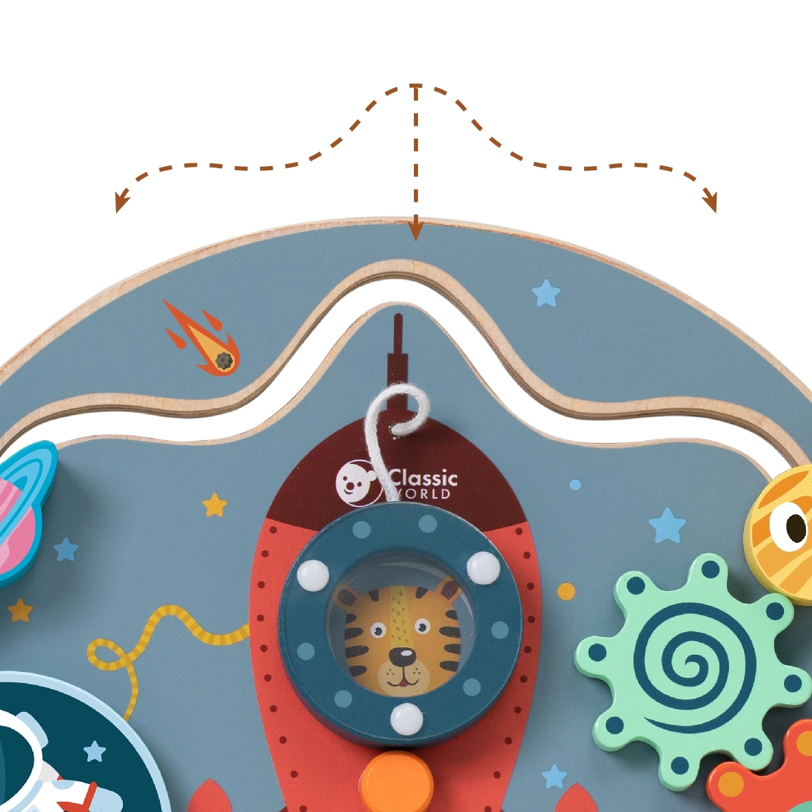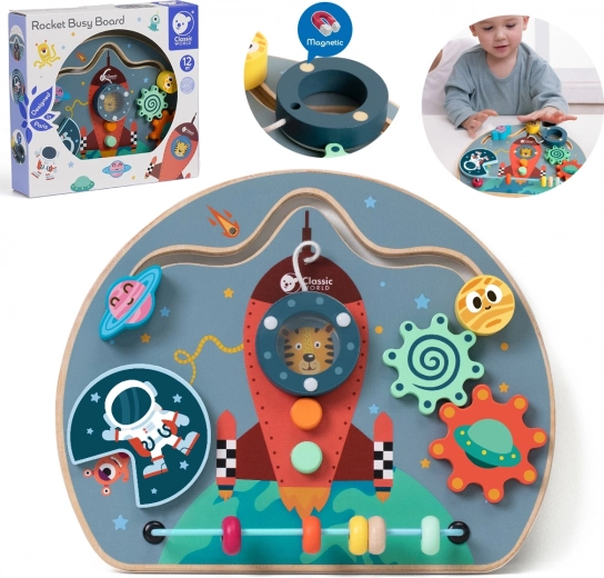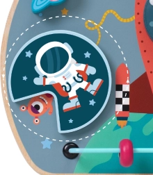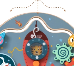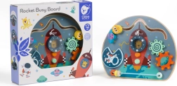 Atraskite žaidimų kupiną kosmosą su medine raketos formos manipuliacine lenta. Vaikas lavins suėmimą, tikslumą ir susikaupimą sukdamas ratukus, stumdamas karoliukus ar spręsdamas paprastą labirintą. Saugus apdirbimas, netoksiški dažai ir patvarios medžiagos užtikrina ilgą ir saugų žaidimą.