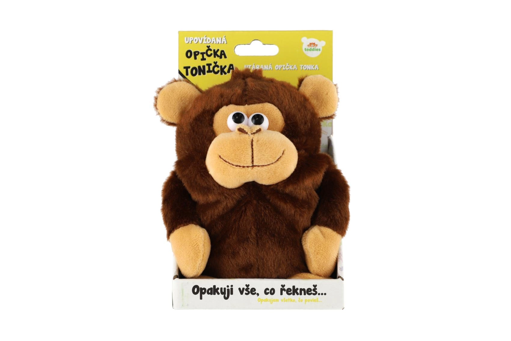 Miela pliušinė beždžionėlė Tonička atneš į jūsų namus daug juoko ir pramogų. Ištarus sakinį, ji juokingai jį pakartoja pakeistu balsu ir tuo pačiu žavingai linksi galva. Dėl kompaktiško 18 cm dydžio puikiai tinka vaikams ir kelionėms. 3× AAA baterijos yra pakuotėje, todėl žaisti galima iš karto po išpakavimo.
