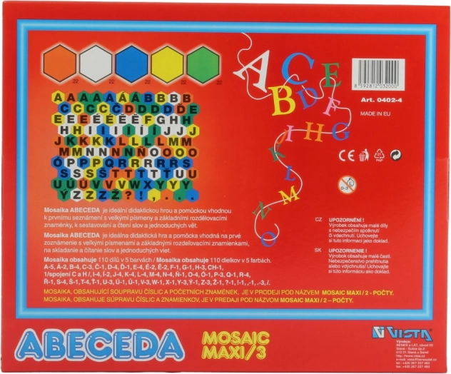 Smagi edukacinė konstravimo mozaika patiems mažiausiems, padedanti žengti pirmuosius žingsnius raidžių ir žodžių pasaulyje. Rinkinyje yra 110 detalių penkių spalvų, kurios skatina smulkiosios motorikos lavinimą, abėcėlės pažinimą ir kūrybiškumą vaikams nuo 4 metų.