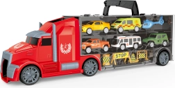 Didelis 42 cm ilgio vilkikas su mašinėlėmis ir sraigtasparniu suteiks daug pramogų vaikams nuo 3 metų. Dėl laisvai besisukančių ratų, mašinėlių pravažiavimo per kabiną ir dėklų abiejose priekabos pusėse mažieji vairuotojai mėgausis kūrybišku žaidimu. Yra ištraukiama rankena patogiam nešiojimui ir pakuotė lietuvių kalba.