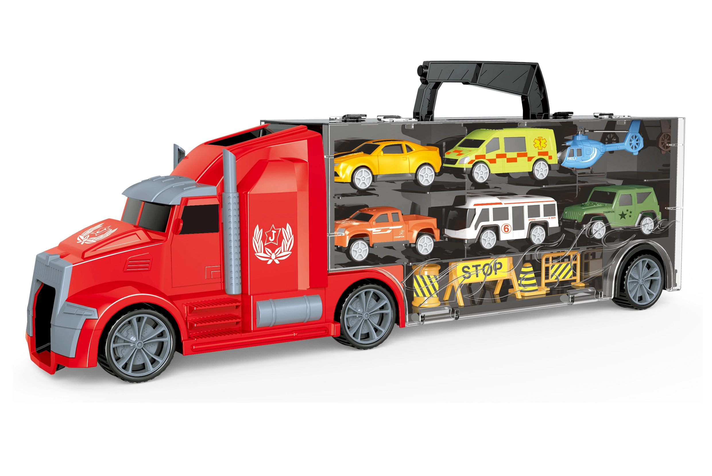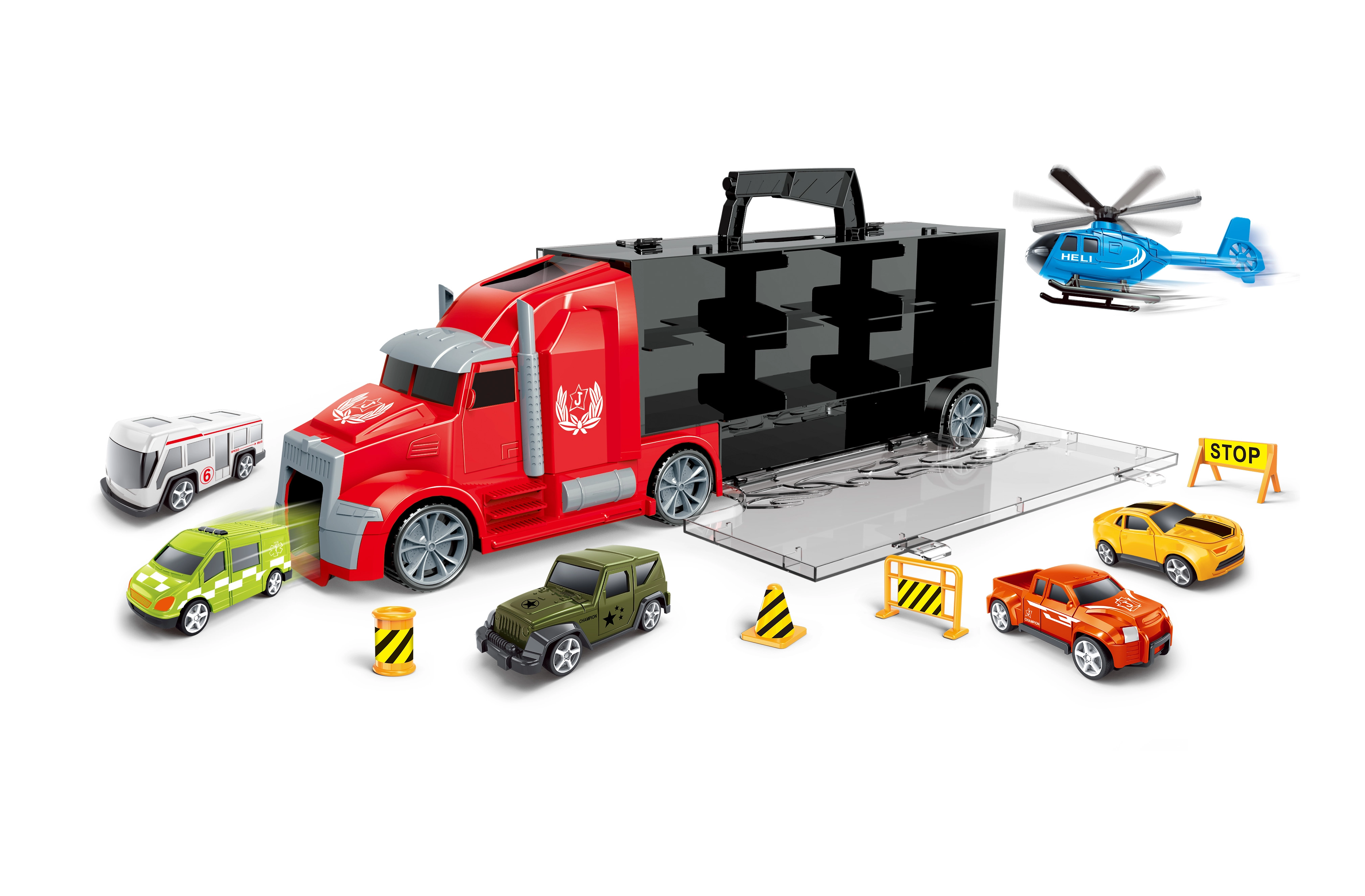 Rinkinyje yra 5 mašinėlės ir 1 sraigtasparnis, todėl pramoga gali prasidėti iškart išpakavus. Patogi ištraukiama rankena priekabos viršuje palengvina nešiojimą. Tiekiama su lietuviška pakuote.