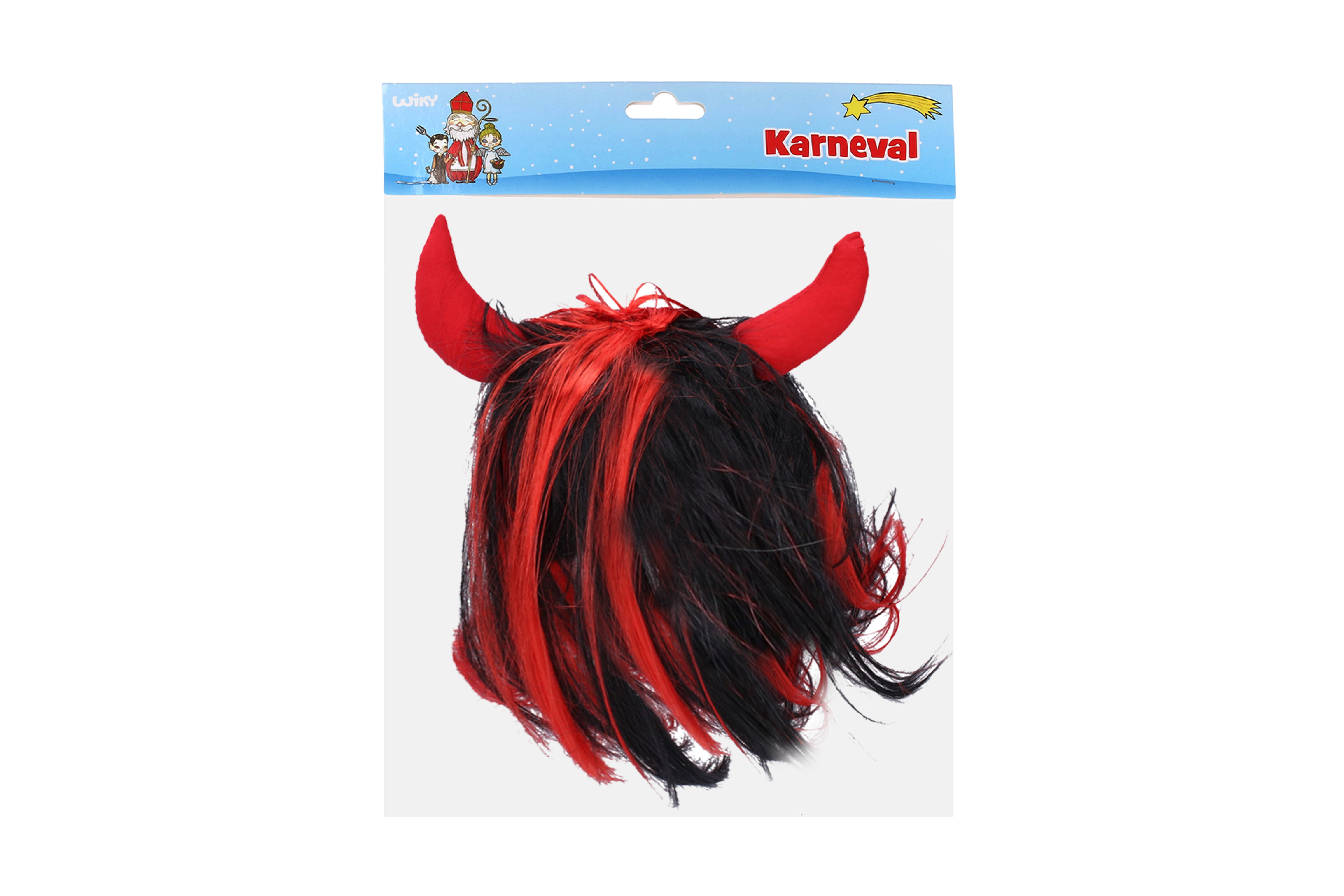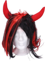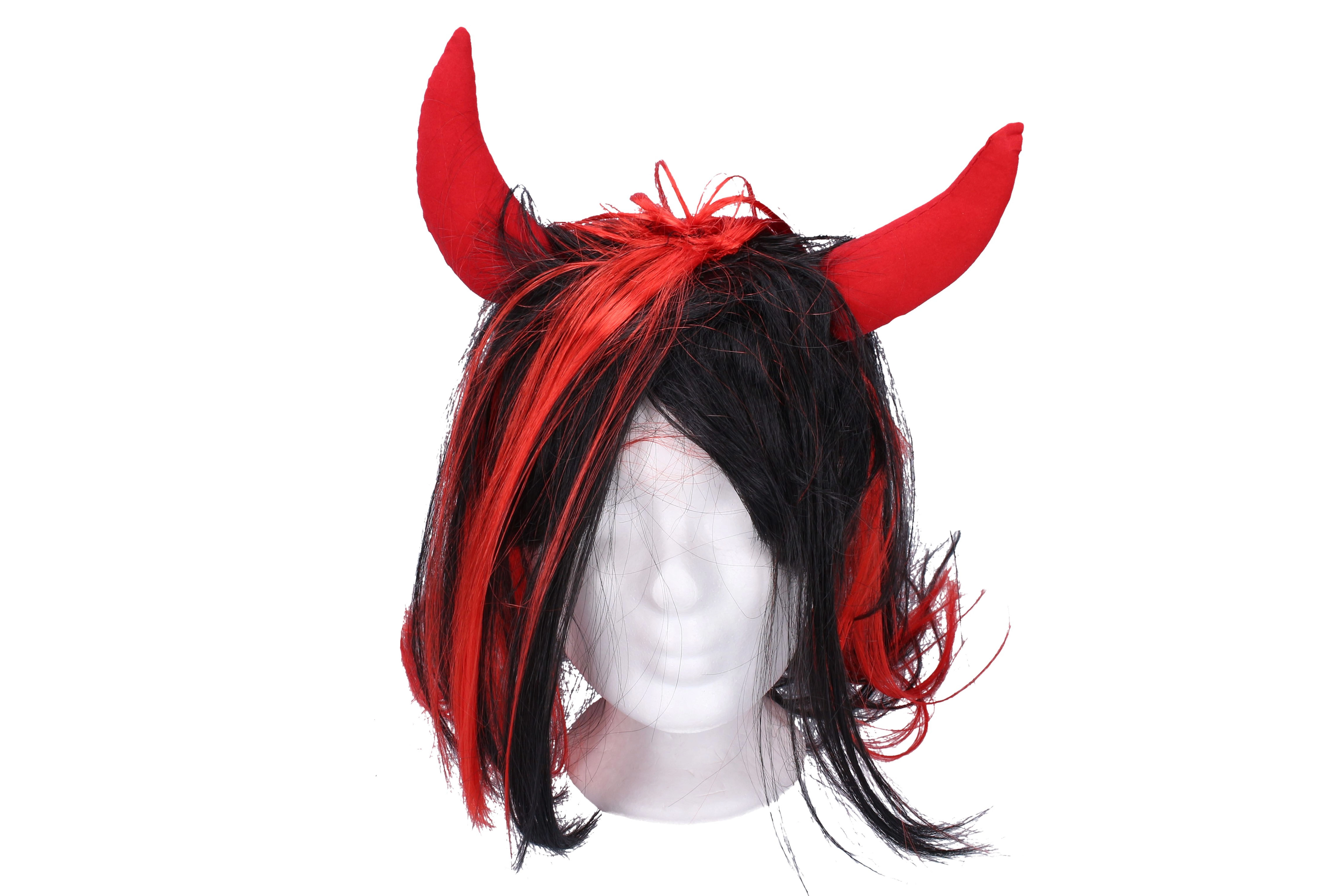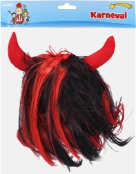 Stilingas velniškas perukas su juodais plaukais ir raudonomis sruogomis, papildytas tekstiliniais raudonais ragais. Idealiai tinka Mikului, maskaradams ir teminiams vakarėliams. Lengvai užsidedamas ir akimirksniu suteikia pragarišką efektą.