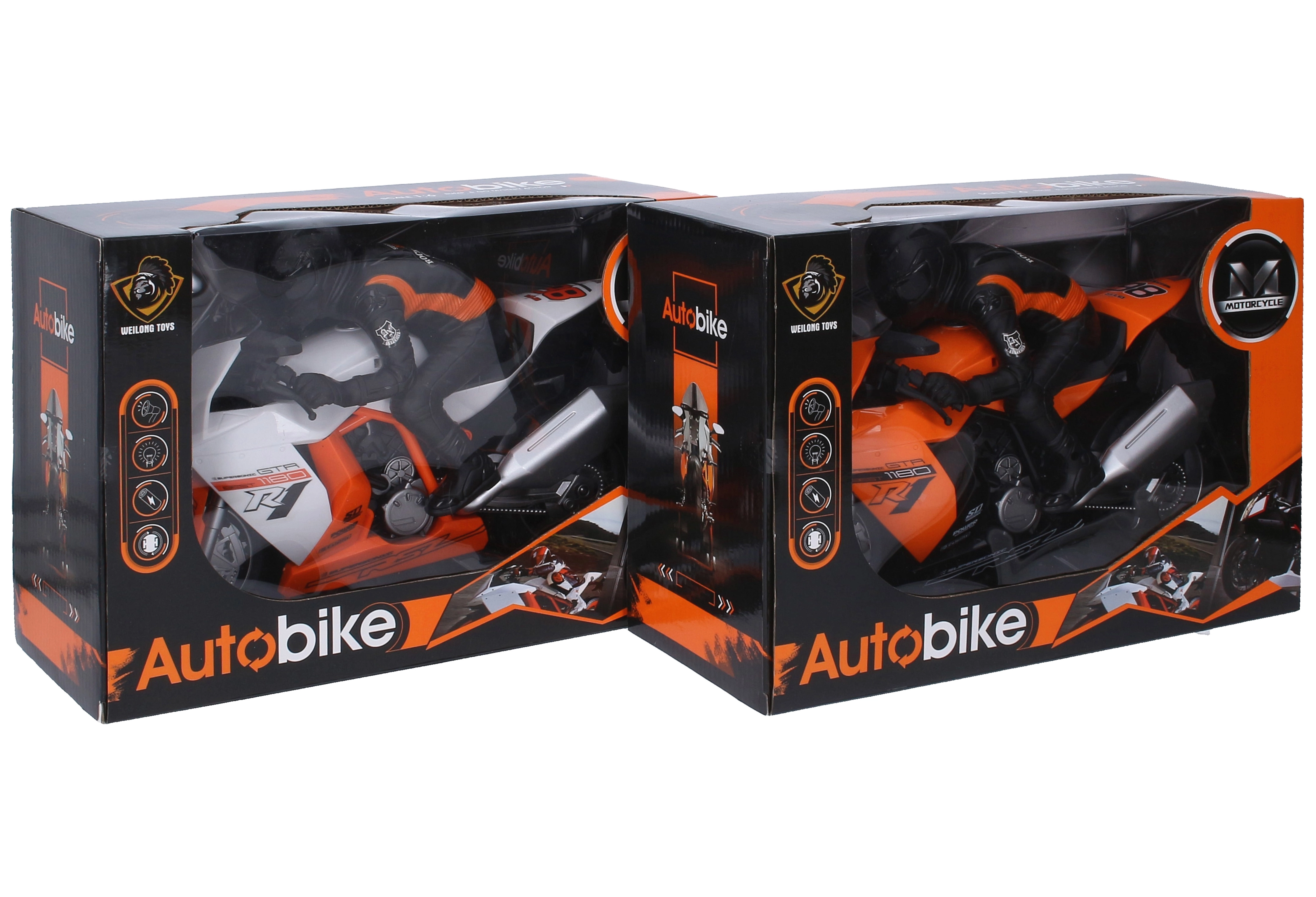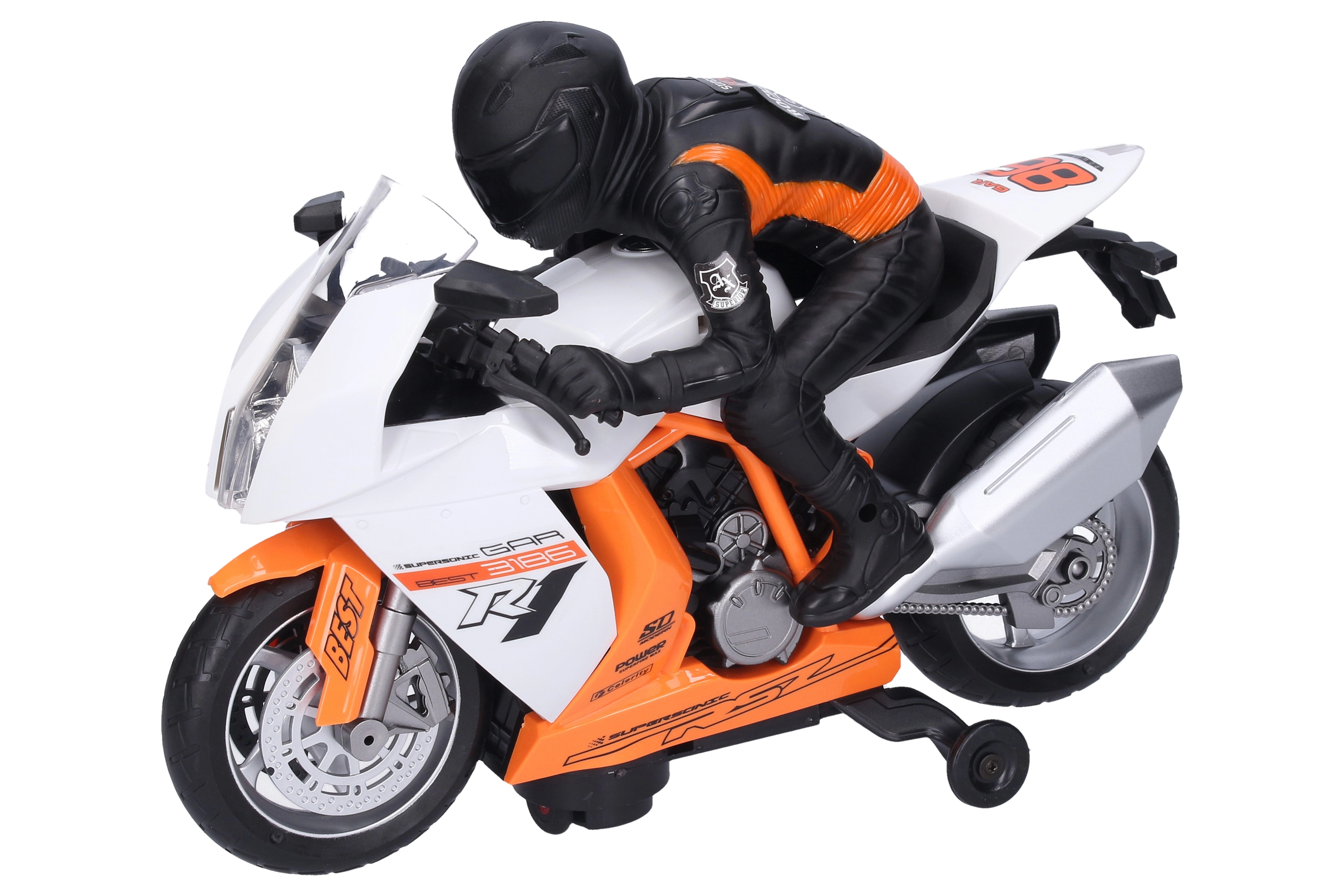 Motociklas turi idealaus 28 cm dydžio korpusą patogiam paėmimui ir valdymui. Galima rinktis iš 2 spalvų variantų – oranžinės ir baltos, kurios puikiai išsiskiria bet kurioje kolekcijoje. Maitinimą užtikrina 4× AA baterijos (nepridedamos).