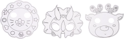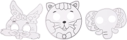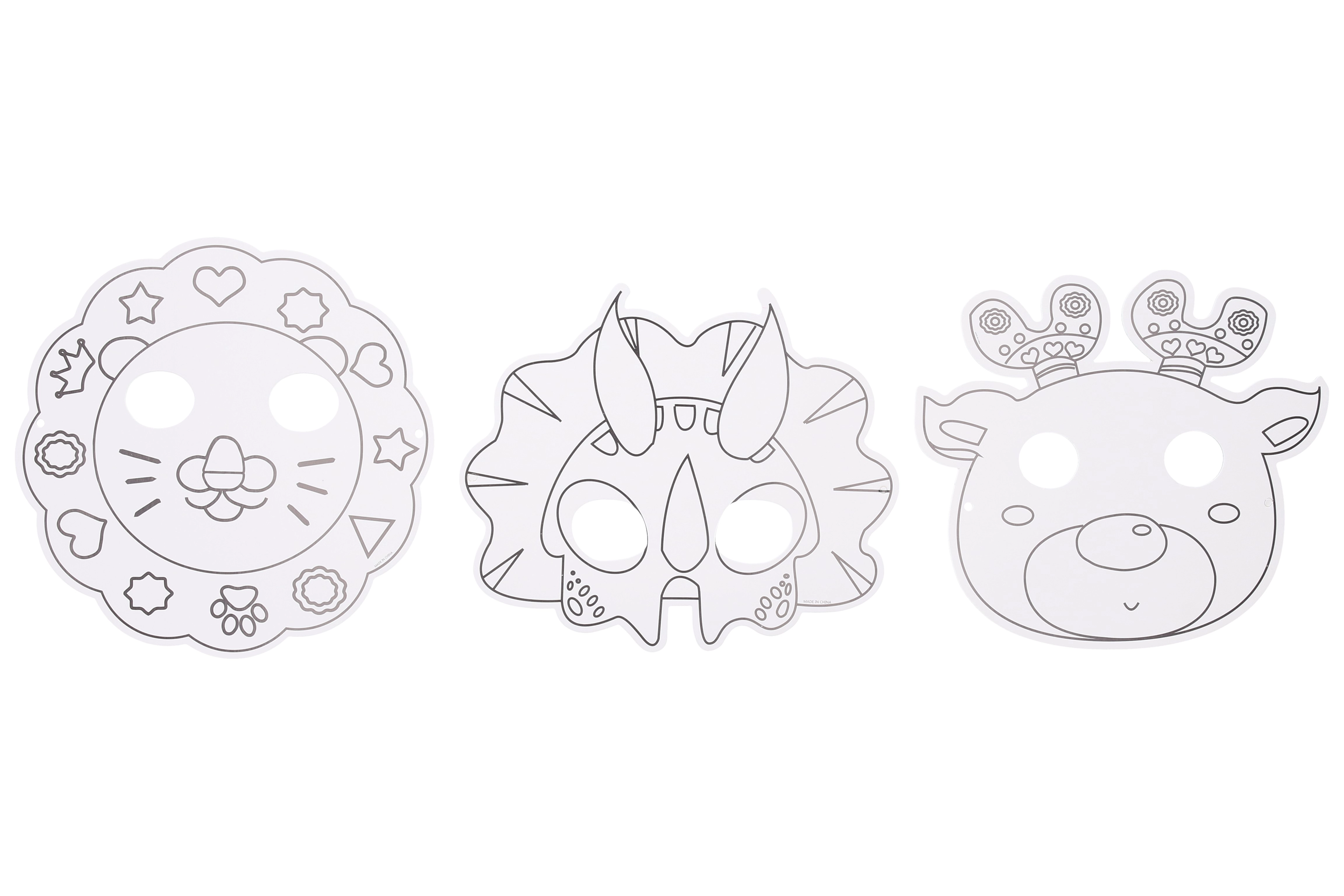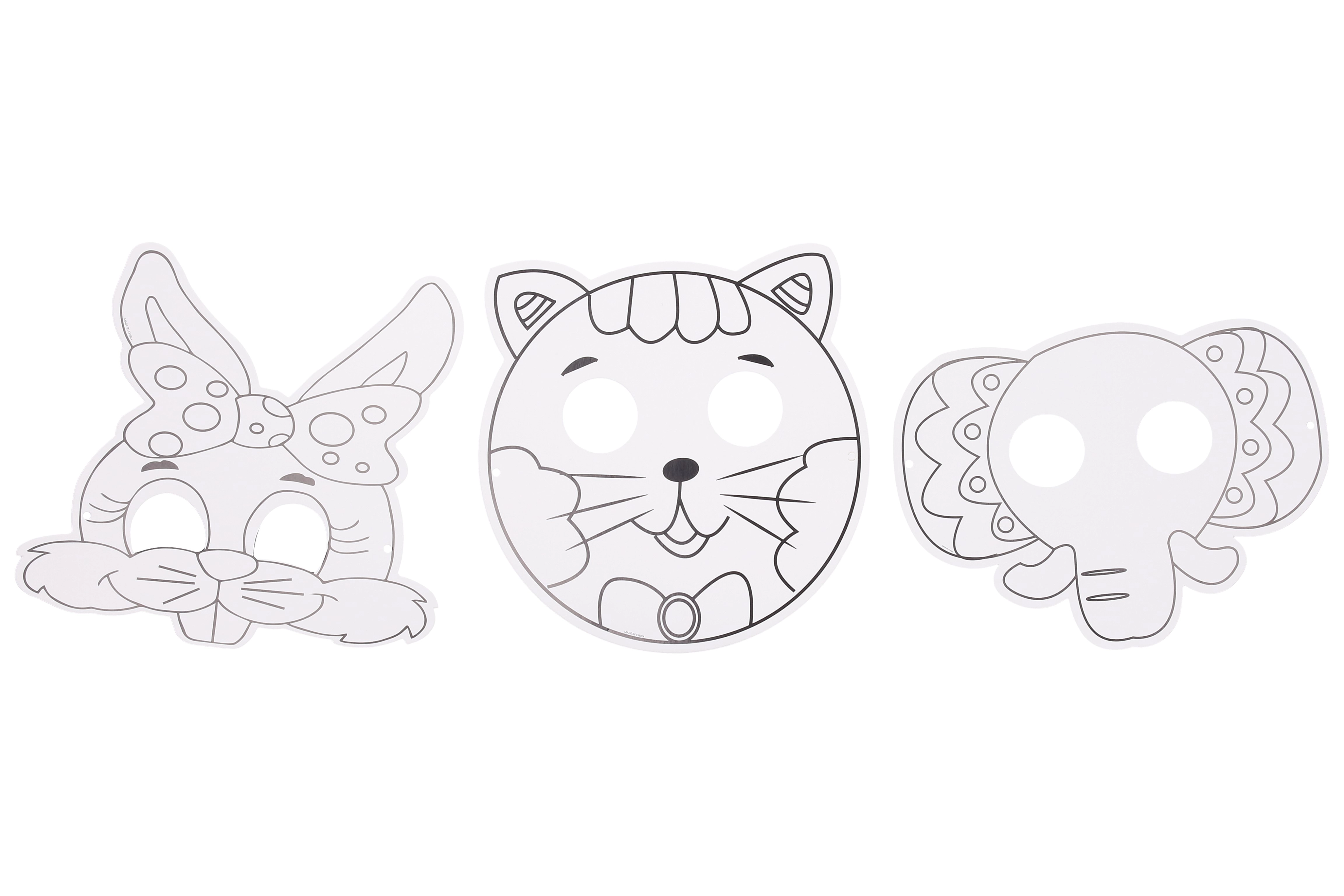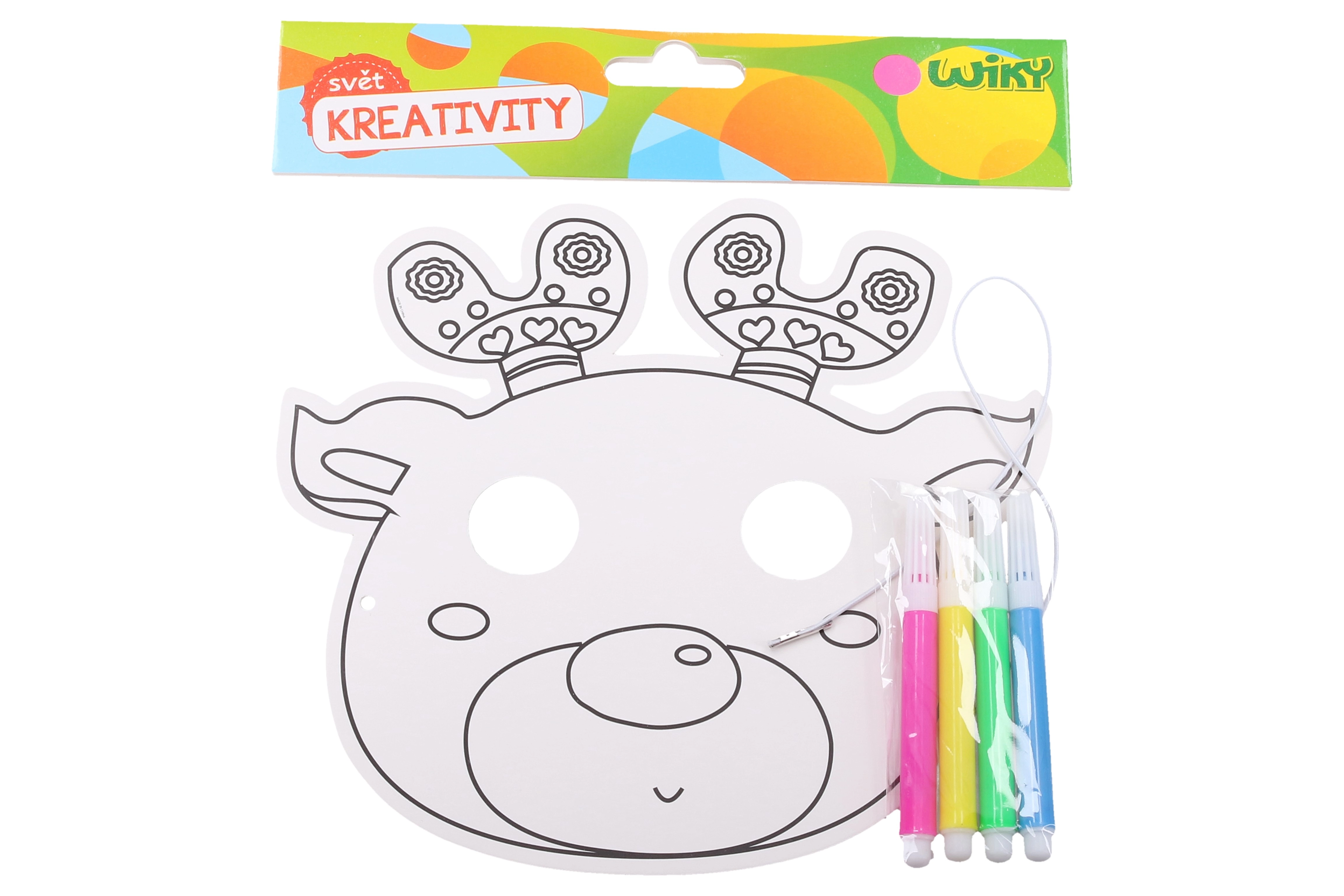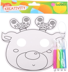 Linksma spalvinama kaukė, dydis 22,5 × 20,5 cm, su 4 flomasteriais pakuotėje ir 6 skirtingais motyvais – idealiai tinka kūrybai, žaidimams ir šventėms.