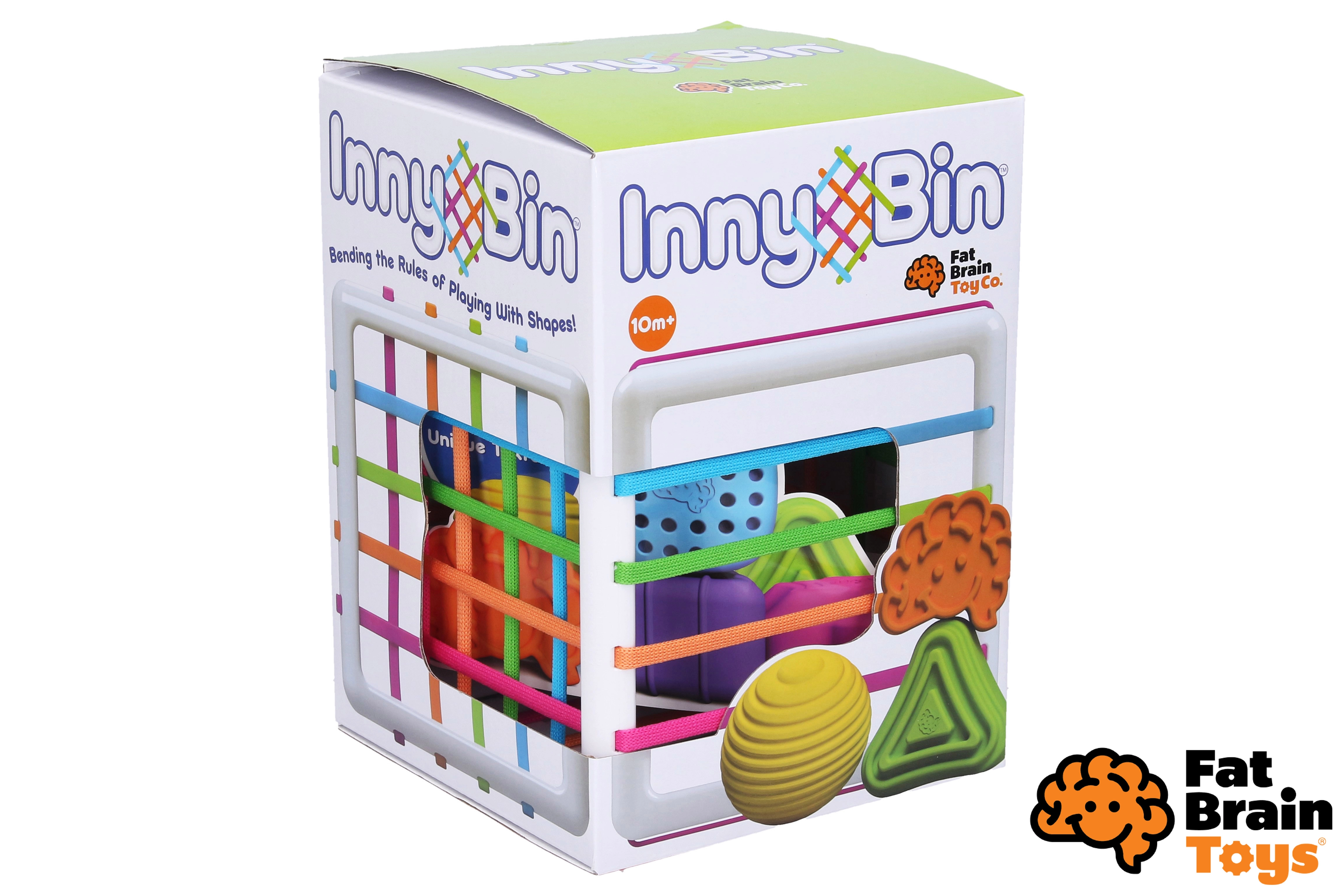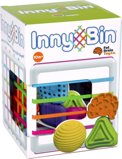 FAT BRAIN InnyBin – tai šiuolaikinis dėliojimo žaislas, paverčiantis klasikinį formų rūšiavimą interaktyviu sensoriniu žaidimu. Vaikai gali formas spausti, paimti, kišti ir traukti per spalvotus elastingus raištelius – nereikia tiksliai taikyti į angą. Tai lavina pirštukų miklumą, kantrybę ir natūralų smalsumą.