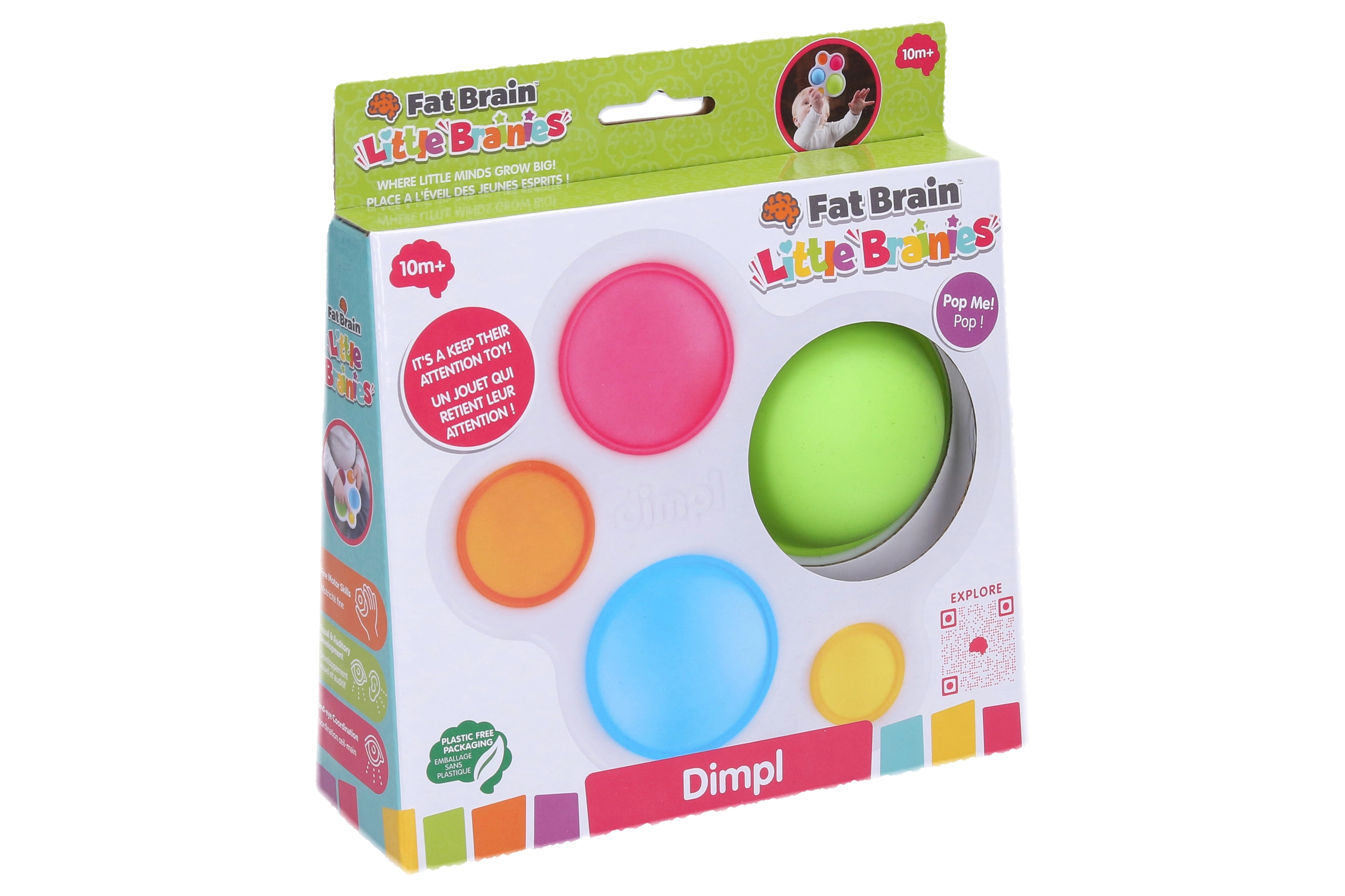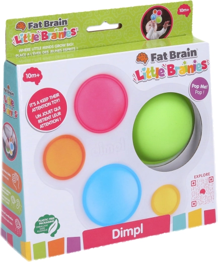 Dimpl iš FAT BRAIN – kompaktiškas jutiminis žaislas su penkiais spalvotais silikoniniais burbuliukais tvirtame plastikiniame rėmelyje. Kiekvieną burbuliuką galima iš abiejų pusių spausti ir „spragsėti“, tai iškart sudomina vaikus ir motyvuoja juos vėl ir vėl tyrinėti.