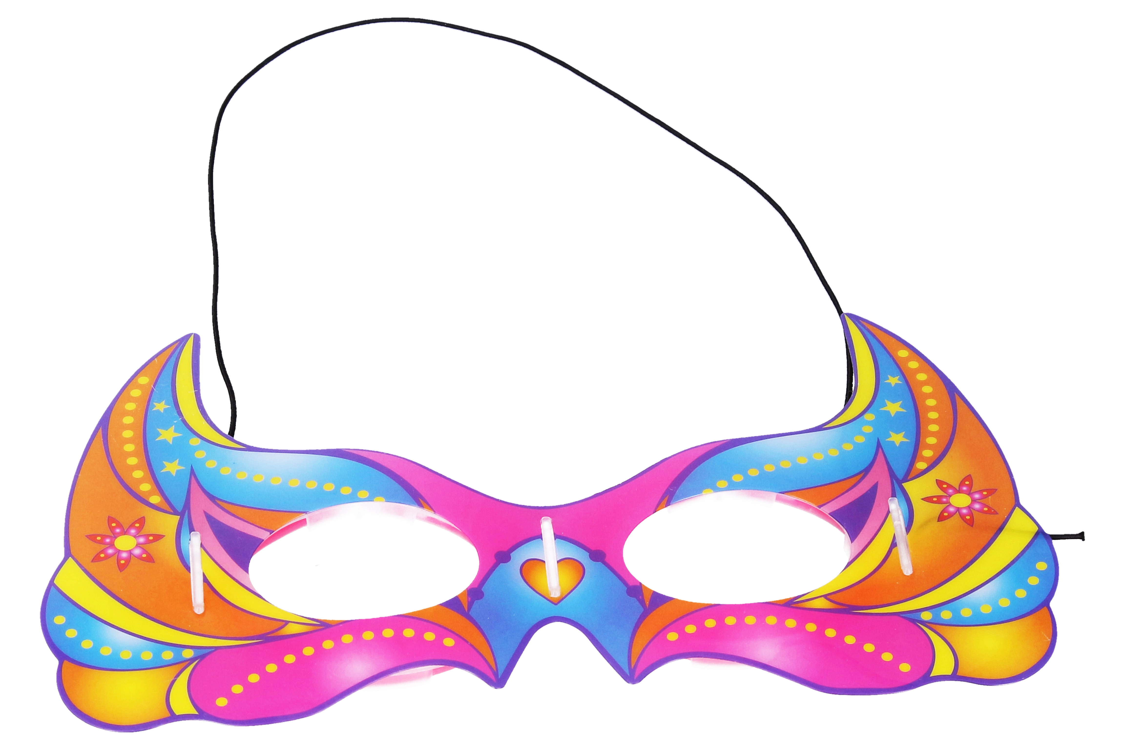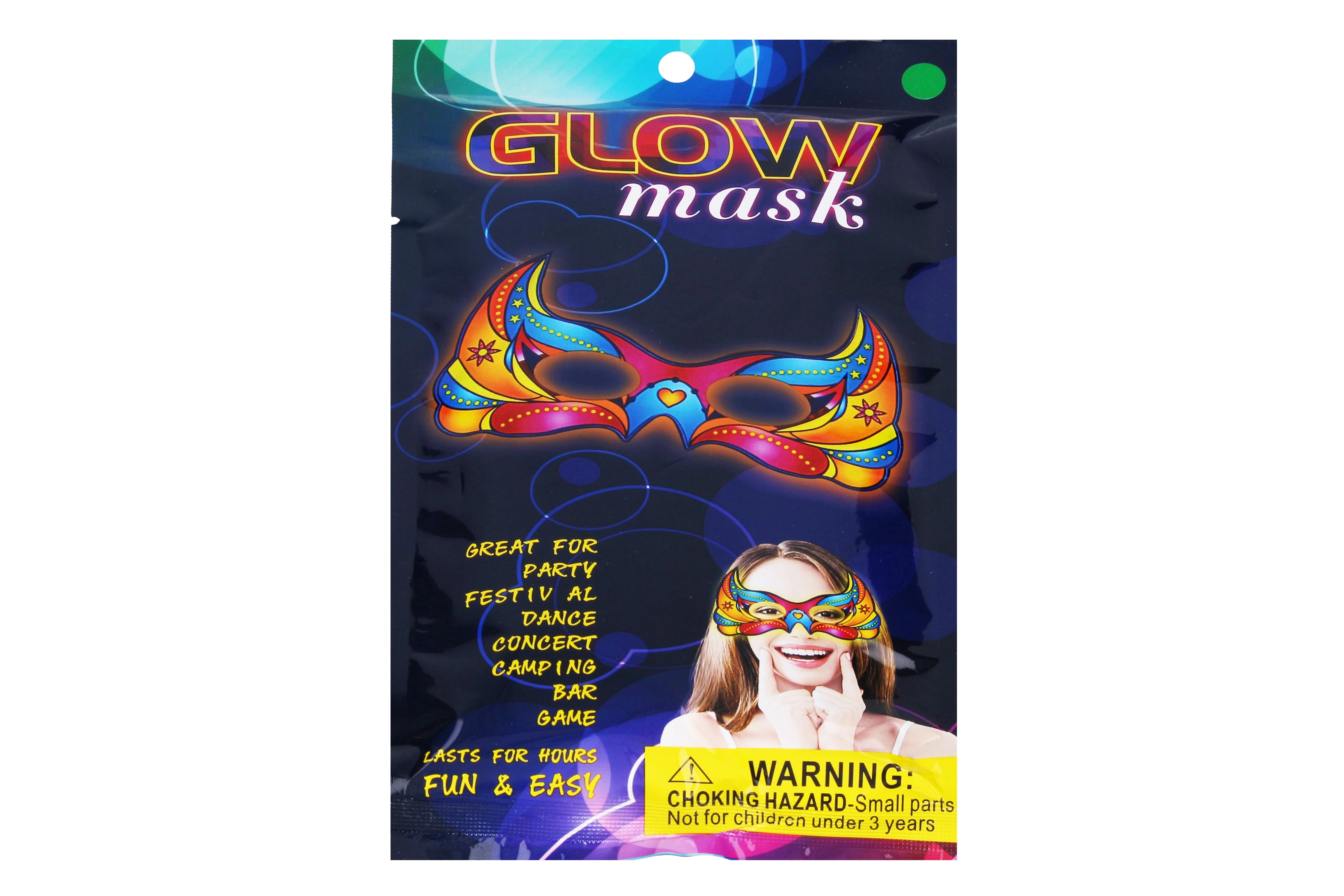 Rinkitės iš 6 skirtingų spalvų ir priderinkite kaukę prie savo aprangos ar renginio temos. Kaukė yra lengva, paprastai naudojama, o aktyvavus šviečiančias lazdelės suteikia ryškią šviesą kelioms valandoms.