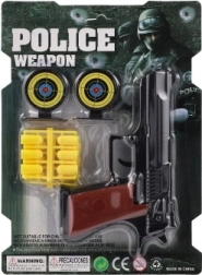 Rinkinyje yra viskas, ko reikia: 12 šovinių ilgam žaidimui ir 2 apvalūs taikiniai taiklumo treniruotėms. Nedidelis pistoleto dizainas skatina vaizduotę ir leidžia įsijausti į mažo policininko ar sportinio šaulio vaidmenį.
