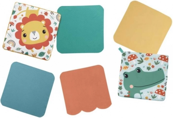 Spalvotų audinių rinkinys su žaismingais motyvais skatina traukti ir spausti, taip lavinant smulkiąją motoriką ir lytėjimo pojūčius.