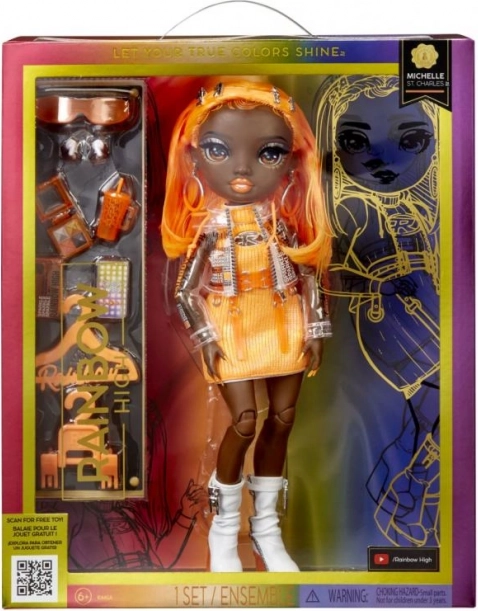Atraskite madingos lėlės Rainbow High Michelle St. Charles žavesį, kuri išsiskiria ne tik savo ryškiais oranžiniais aksesuarais, bet ir stilingu aprangu. Maždaug 22 cm aukščio, idealiai tinka vaikams nuo 6 metų. Ši lėlė ne tik lavina vaizduotę, bet ir yra puiki dovana dėl pakuotės, kurios išmatavimai 8.1 x 20.3 x 30.5 cm.