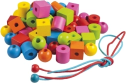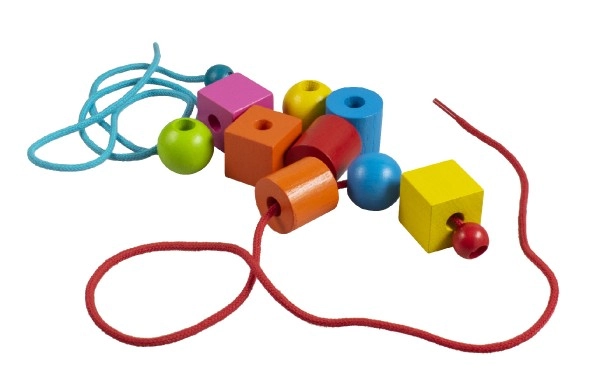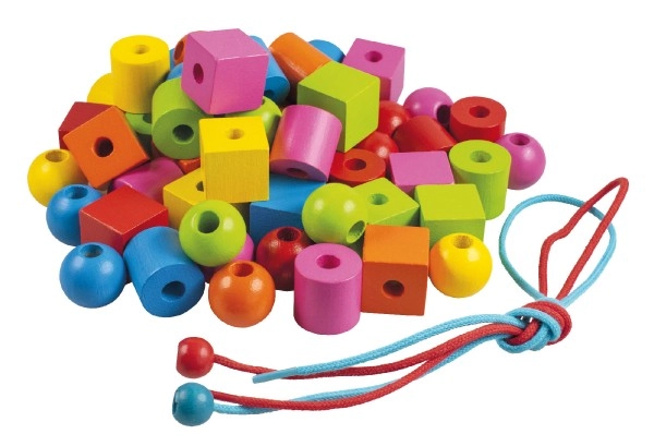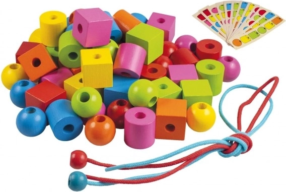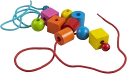 Smagus didelių medinių karoliukų rinkinys su virvele ir kortelėmis pagal pavyzdžius pirmiesiems vėrimo bandymams. Skatina smulkiąją motoriką, akių–rankų koordinaciją ir spalvų bei formų atpažinimą. Saugus dizainas, 20 mm skersmens karoliukus lengva laikyti net patiems mažiausiems.
