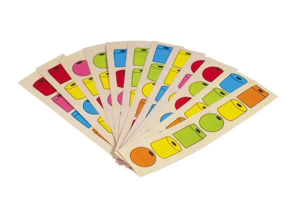 Spalvotos kortelės su paprastais raštais padeda vaikams atkartoti sekas ir mokytis atpažinti spalvas bei formas.