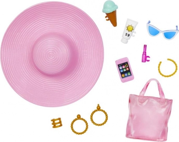 Papildykite Barbės stilių plačiakraščiu skrybėliu, „cat-eye“ saulės akiniais ir rožiniu krepšiu, pilnu paplūdimio smulkmenų.