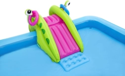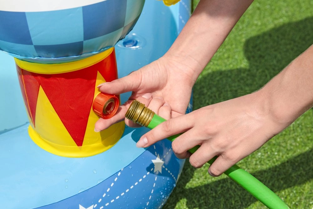Pripučiamas parkas siūlo baseiną, čiuožyklą, purkštuką ir kosminį žiedų mėtymo žaidimą, kurie užtikrins pramogas ilgam.