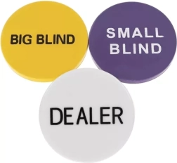 DEALER, SMALL BLIND ir BIG BLIND žetonai užtikrina aiškius raundus ir sklandžią kiekvienos partijos eigą.