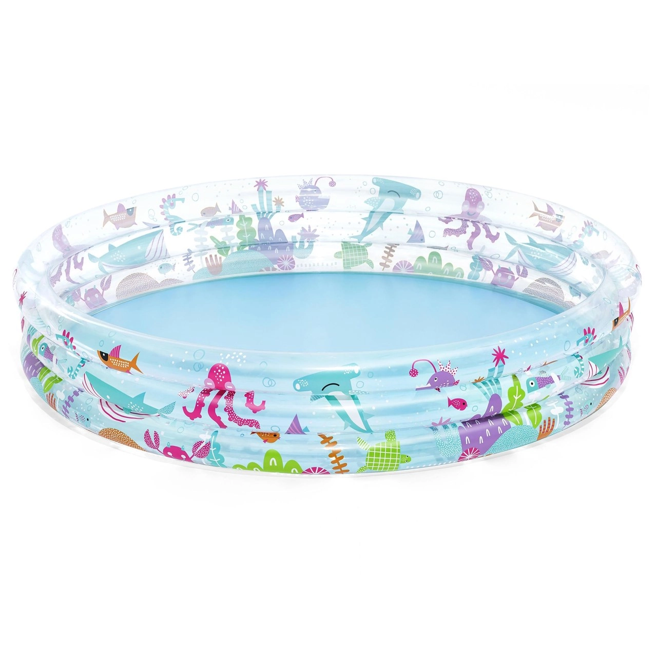 Pripučiamas baseinas BESTWAY Deep Dive – puikus pasirinkimas pirmiesiems vaikų vandens džiaugsmams nuo 3 metų. Kokybiška PVC medžiaga ir trys atskirai pripučiami žiedai užtikrina stabilumą, patvarumą ir patogų naudojimą. Spalvingas povandeninis dizainas su žuvytėmis ir augalais iškart patraukia vaikų dėmesį.