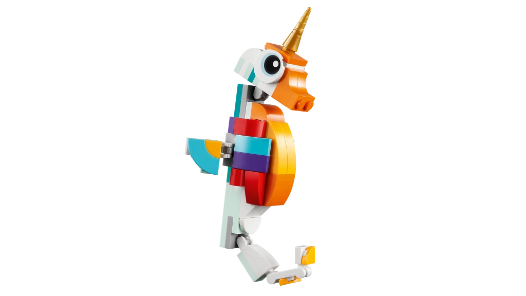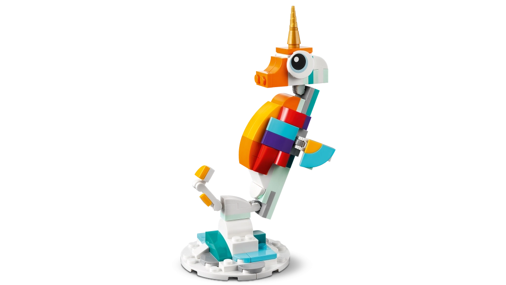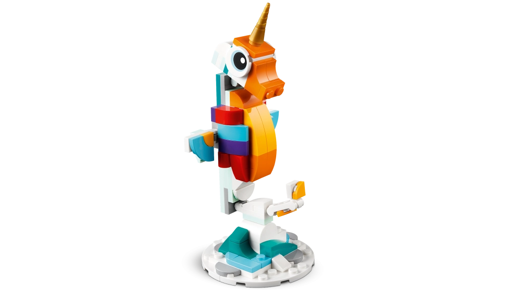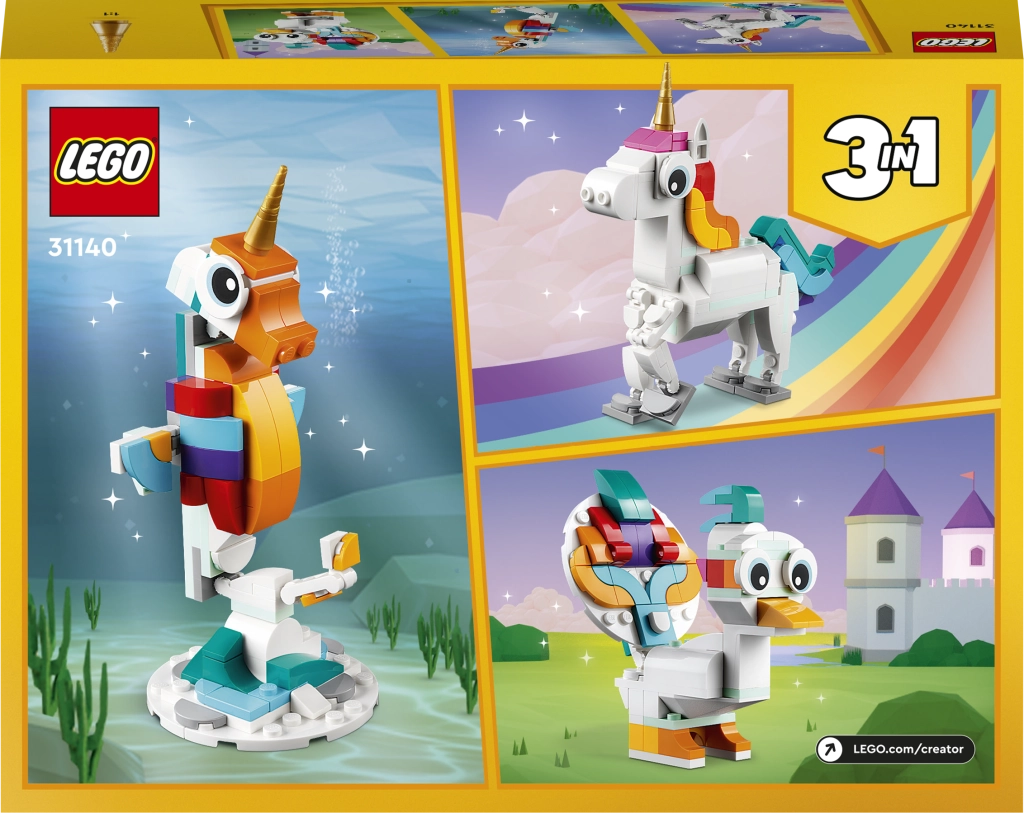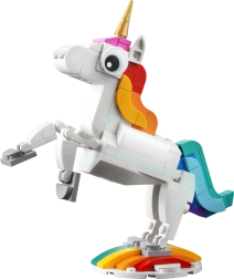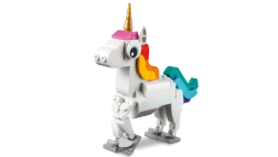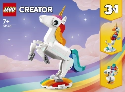 Atraskite fantazijos pasaulį su LEGO Creator 3 iš 1 rinkiniu Stebuklingas vienaragis. Vaikai nuo 7 metų galės kurti ir žaisti su trimis modeliais viename – vienaragiu, jūriniu jūrų arkliuku ir povo modeliu. Judančios dalys, spalvingas dizainas ir galimybė eksponuoti ant stovelių pavers kiekvieną žaidimą magišku nuotykiu.