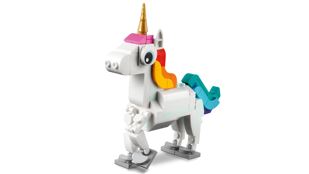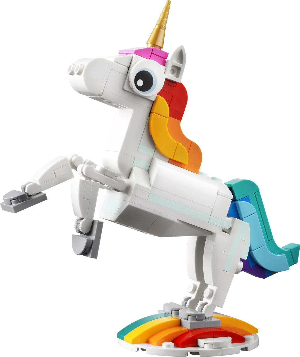Su šiuo magišku rinkiniu vaikai pastatys žavų vienaragį su auksiniu ragu, vaivorykštine uodega ir judančiomis kojomis bei kanopomis. Modelį galima eksponuoti ant vaivorykštinio pjedestalo ir pastatyti į tradicinę pozą ant dviejų galinių kojų arba palikti stovėti ant visų keturių.