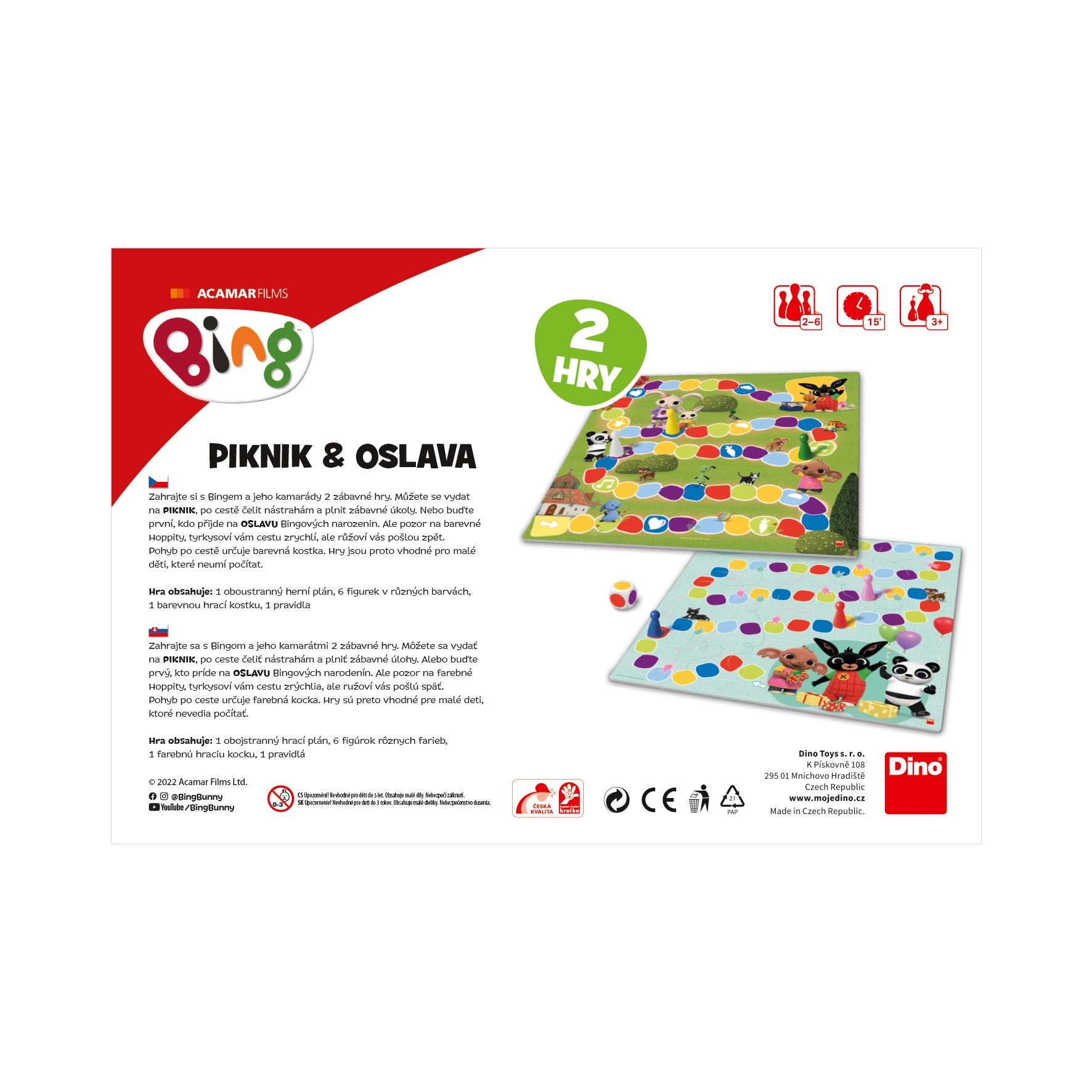 Ženkite į BING ir jo draugų pasaulį su dviejų stalo žaidimų rinkiniu viename. Leisitės į pikniką, kupiną užduočių ir staigmenų, ar tapsite pirmuoju, kuris pasieks gimtadienio šventę? Spalvotas kauliukas nustato judėjimą trasa, tad žaidimą lengvai mėgausis ir vaikai, kurie dar nemoka skaičiuoti. Specialūs langeliai su spalvotais Hoppity pagreitins kelią arba nusiųs atgal – įtampa garantuota!