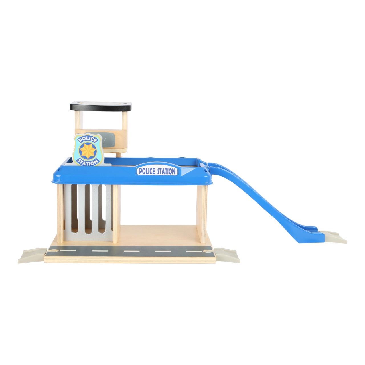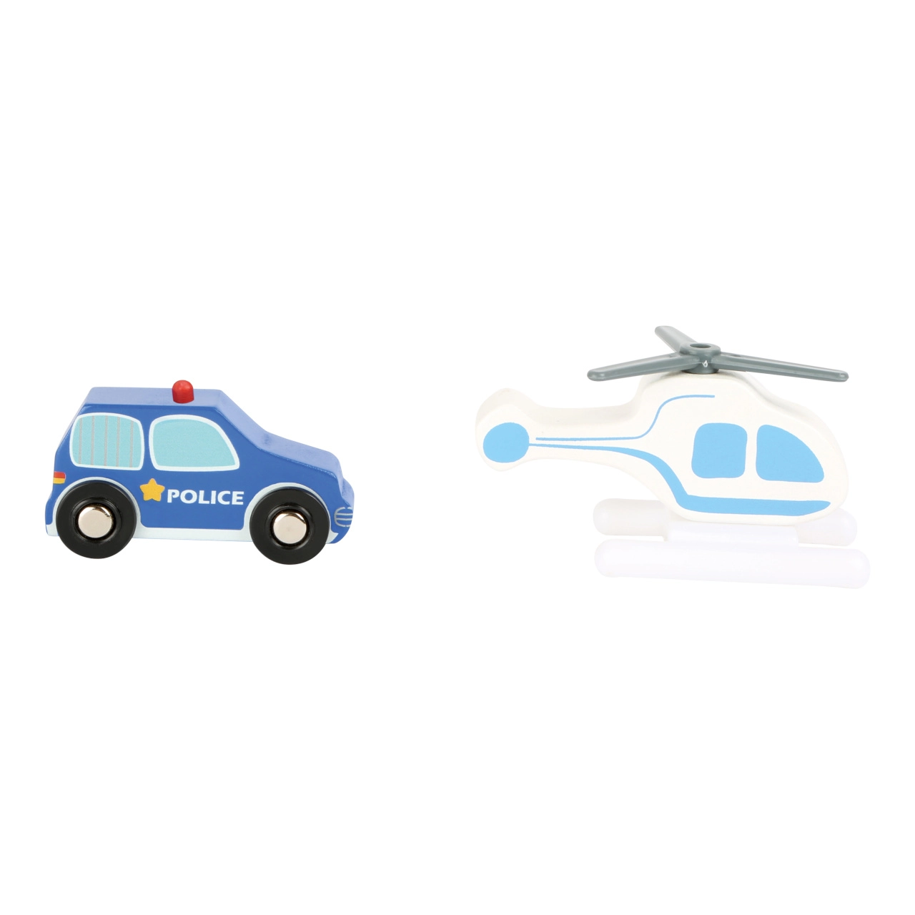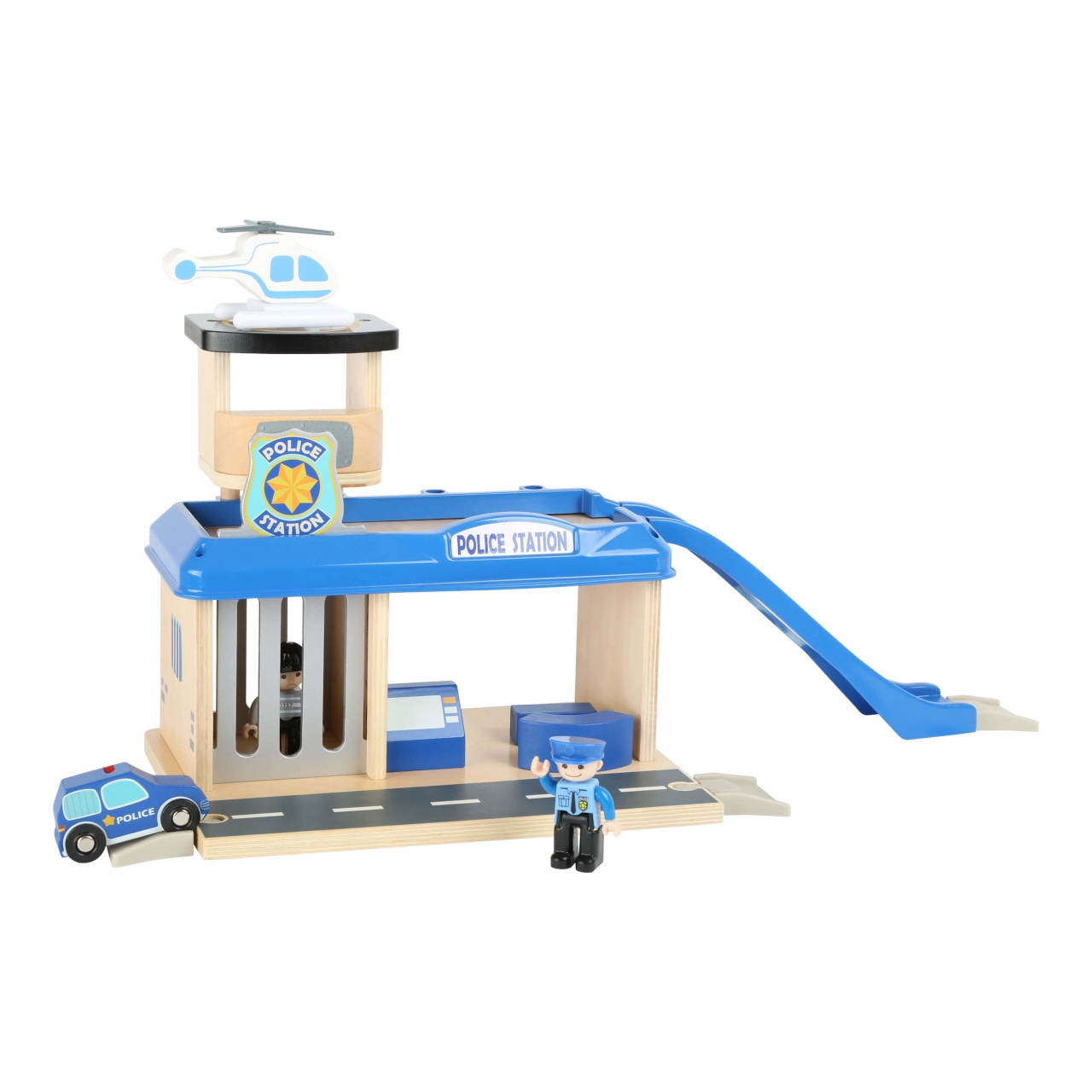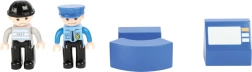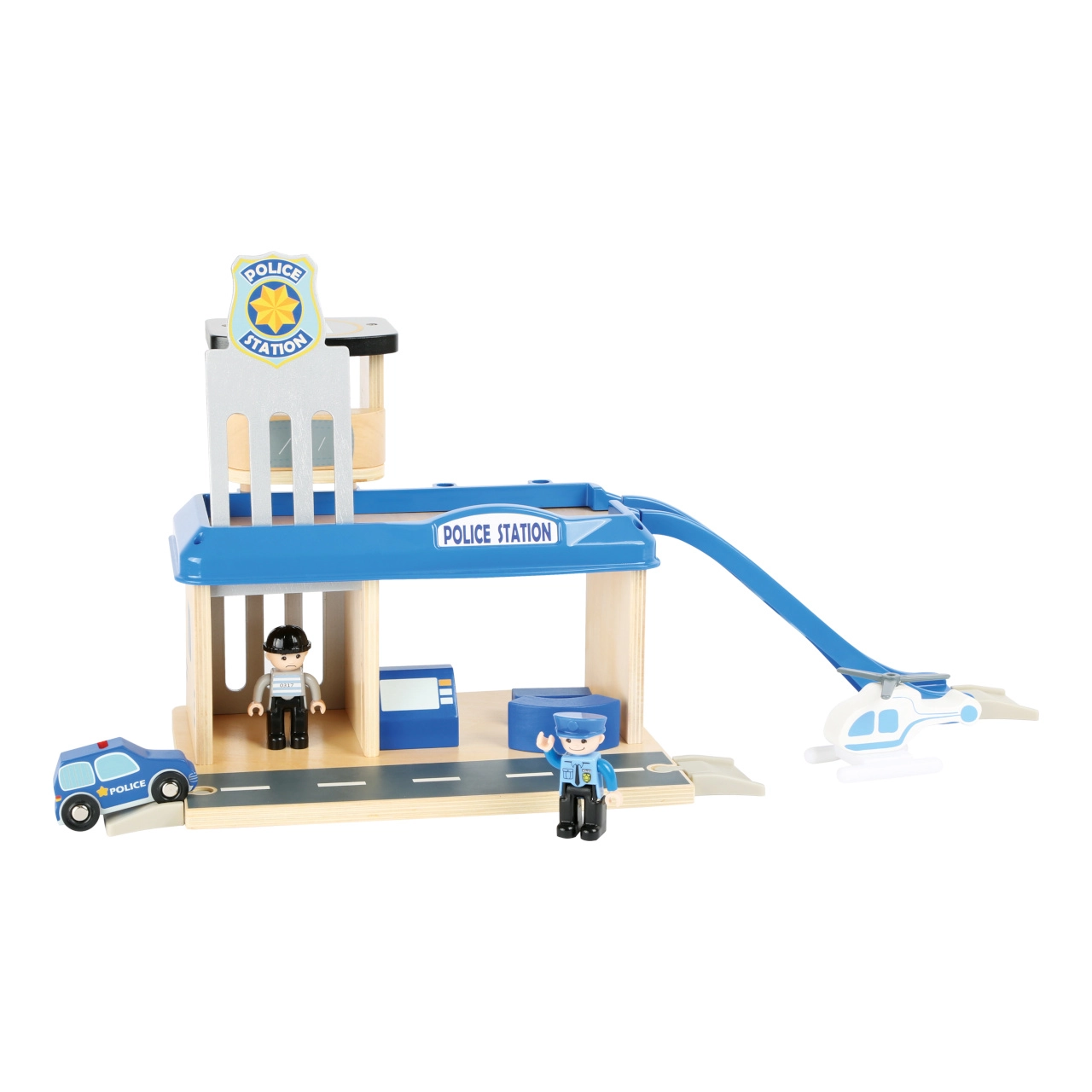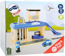 Padovanokite vaikams veiksmo istorijų pasaulį su šia small foot policijos stotimi iš 100 % FSC® medienos. Dviejų aukštų stotis su bokštu ir sraigtasparnių aikštele, kamera su ištraukiamomis grotomis ir įvažiavimo rampa pateikiama su gausiais priedais: policijos automobiliu, sraigtasparniu ir dviem figūrėlėmis. Tvirta medienos ir aukštos kokybės plastiko kombinacija užtikrina patvarumą ir ilgą tarnavimo laiką, be to, rinkinys suderinamas su kitų gamintojų geležinkelio trasomis.